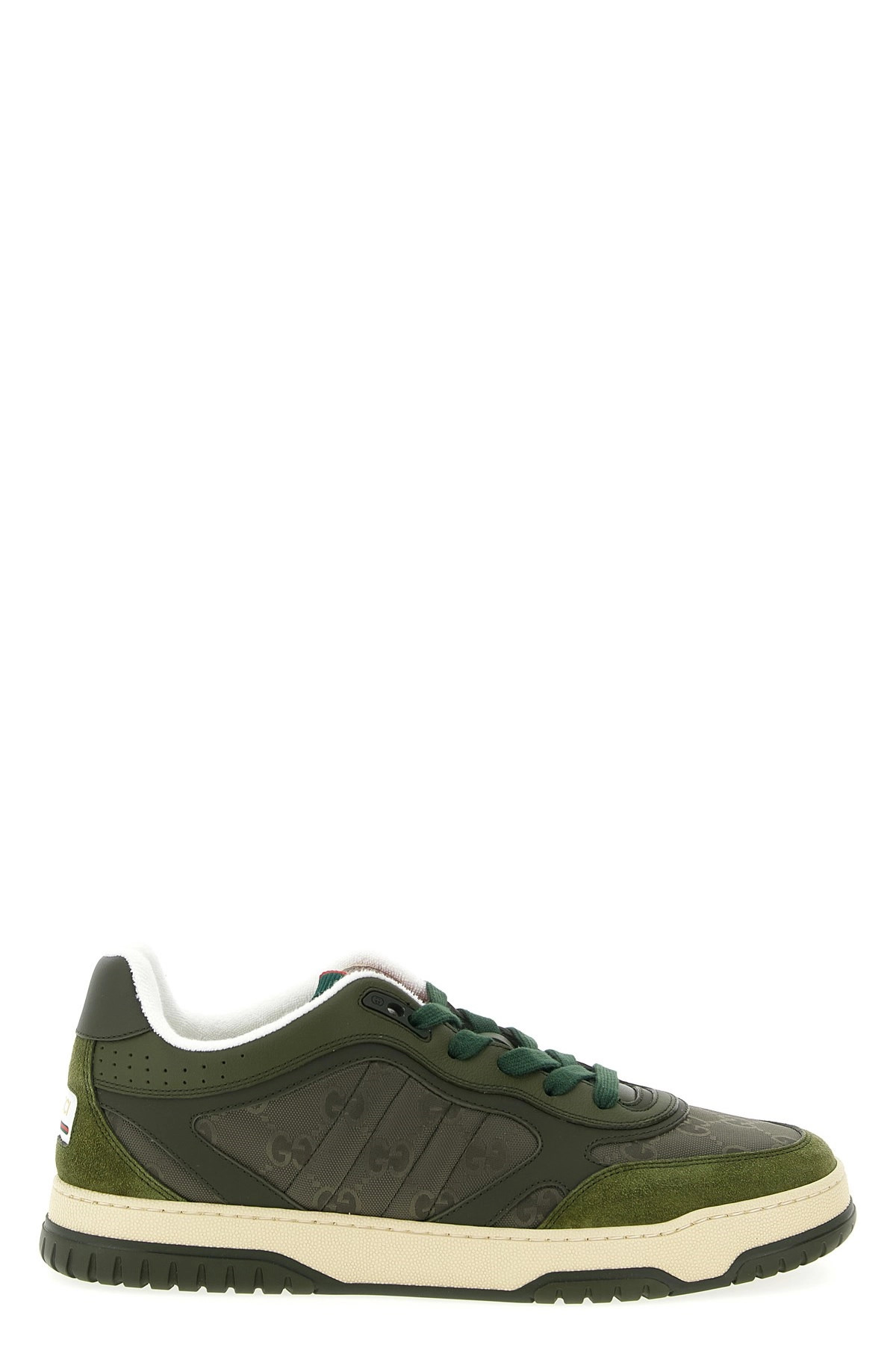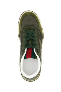cod. 831661AAEX33343 'Gucci Re-Web' sneakers in GG nylon, suede and smooth leather, 'Nastro Web' tongue, lace-up closure, back logo patch, rubber sole. Color: Green Size & Fit: UK MEN Composition: 100% calfskin leather (Bos Taurus) Made in: Italy PROMO CODE NOT APPLICABLE