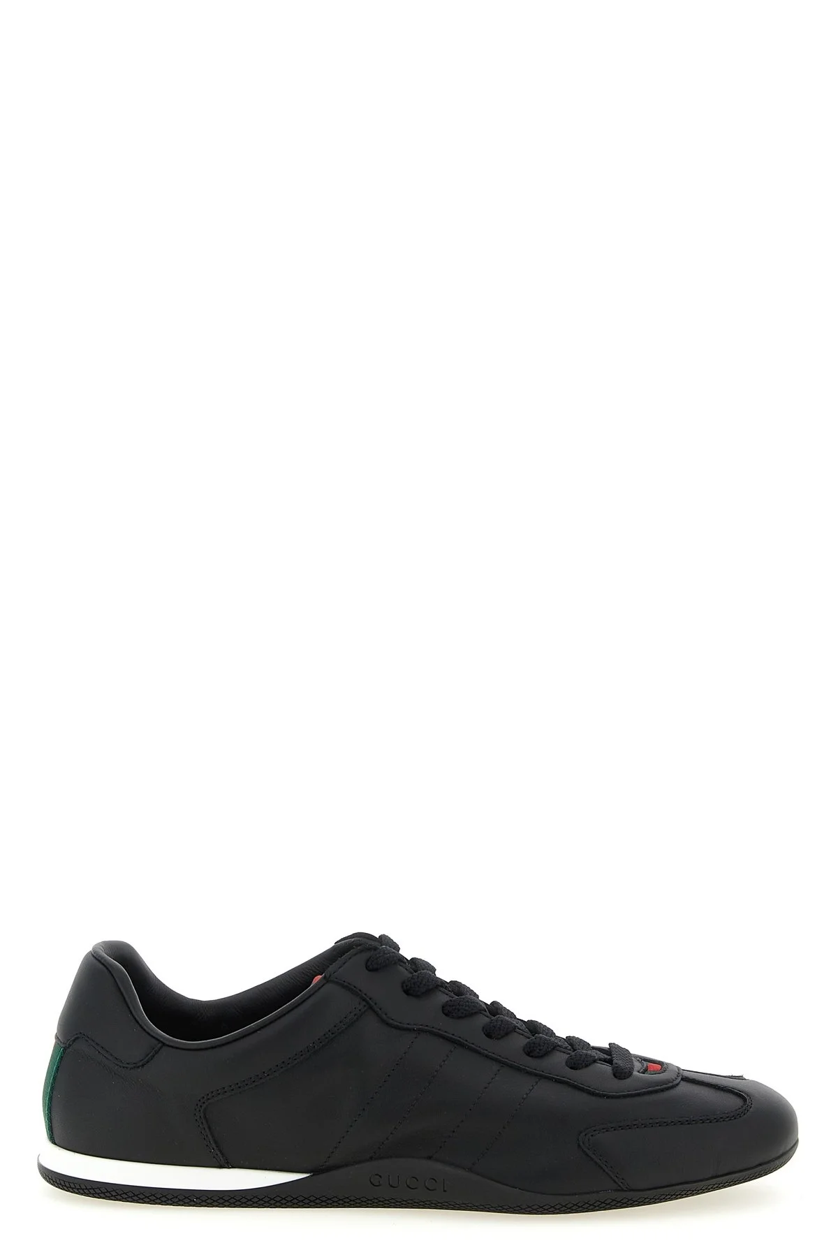 cod. 857018AAFUH1086 'Gucci Shift' leather sneakers, Nastro Web on tongue and heel, ultralight design, lace-up closure, rubber sole. Color: Black Size & Fit: UK MEN Composition: 100% calfskin leather (Bos Taurus) Made in: Italy