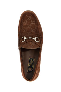 cod. 816185AADWC2256 'Horsebit 1953' suede loafers with embossed GG pattern, front metal clamp, leather sole, foldable heel. Color: Brown Size & Fit: UK MEN Composition: 100% calfskin leather (Bos Taurus) Made in: Italy