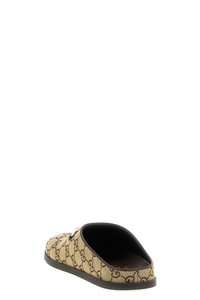 cod. 837130FAB102543 GG fabric sabots with leather details, rounded toe, front metal clamp and rubber sole. Color: Beige Size & Fit: EU WOMEN Composition: 71% cotton, 29% polyester Made in: Italy