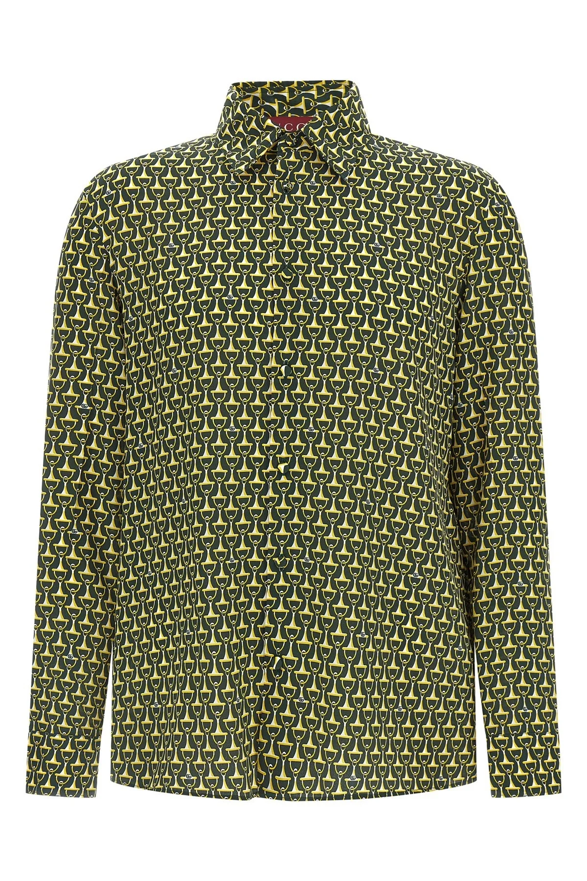 cod. 847034ZAT4Z3061 Crepe de Chine print silk shirt All-over horsebit, pointed collar, front button closure, long cuffed sleeves, side slits. Color: Green Size & Fit: Slim fit Composition: 100% silk Made in: Italy