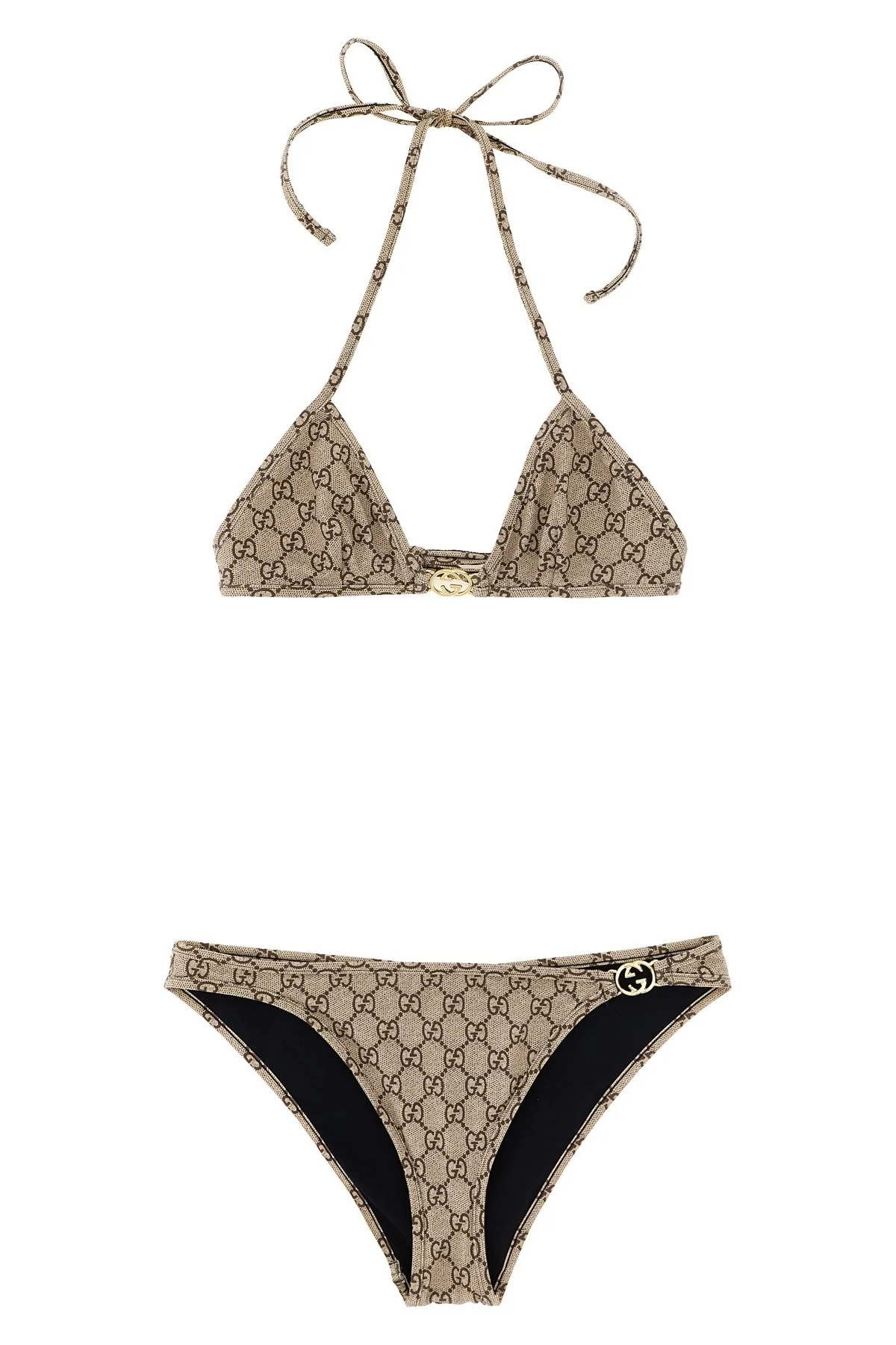 cod. 688999XHAK32270 Stretch 'GG' jersey bikini with metal 'Incrocio GG' logo on the front, triangle top with lacing and briefs with medium cover. Color: Beige Size & Fit: true to size fit Composition: 100% fabric Made in: Italy
