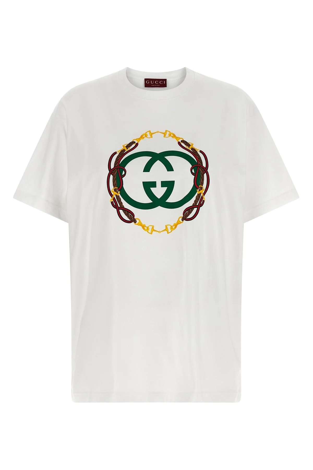 cod. 837959XJHMY9081 T-shirt in medium cotton jersey with 'Incrocio GG' print and front bridle embroidery, crew neck, short sleeves and dropped shoulders. Color: White Size & Fit: Comfort fit Composition: 100% cotton Made in: Italy PROMO CODE NOT APPLICABLE