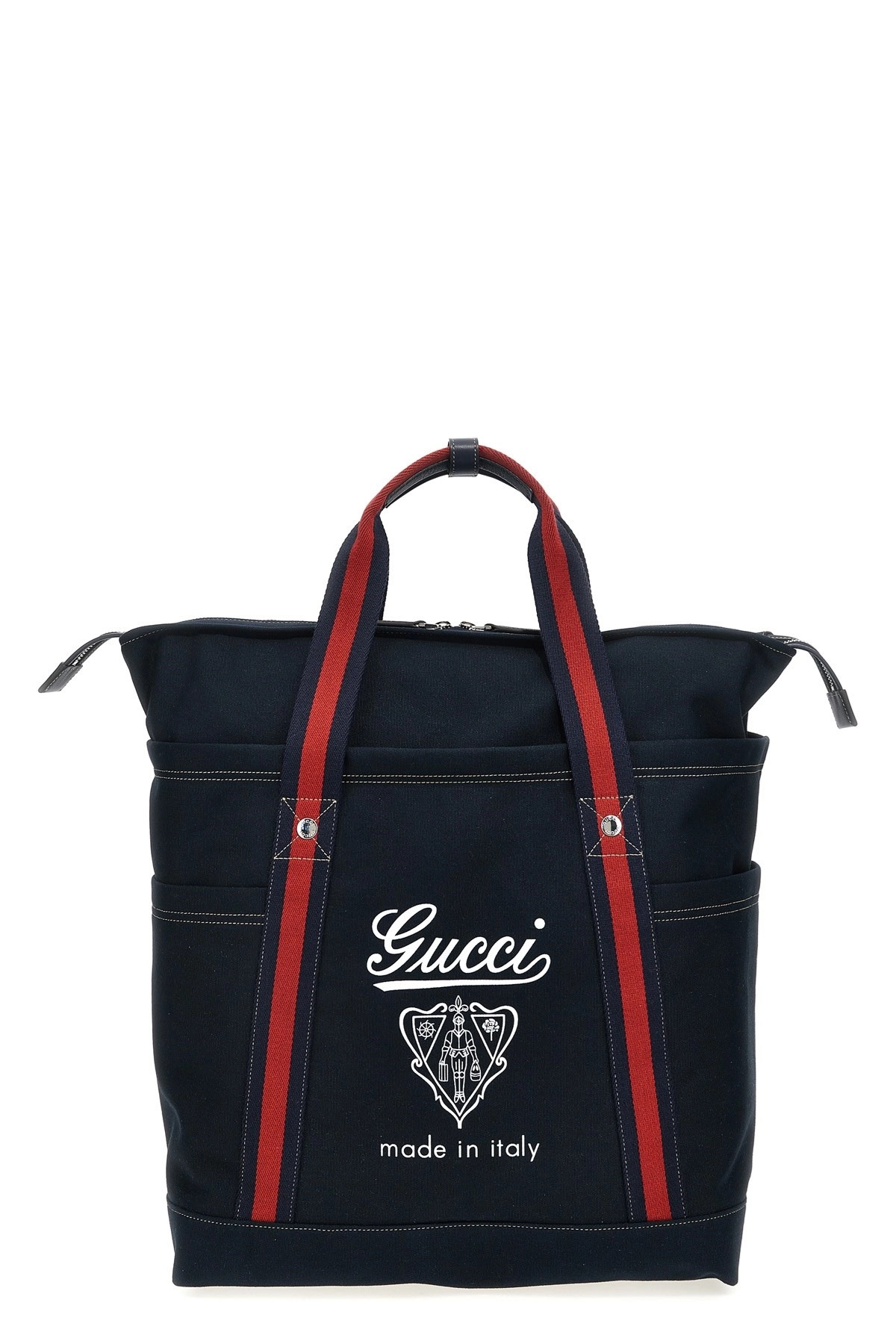 cod. 816863FAD784044 Large cotton shopping bag with leather details, contrast front coat of arms print, double fixed handle in Nastro Web fabric, top zip closure, pockets. Color: Blue Size & Fit: W 39 x H 45 x D 19 cm Composition: 100% cotton Made in: Italy