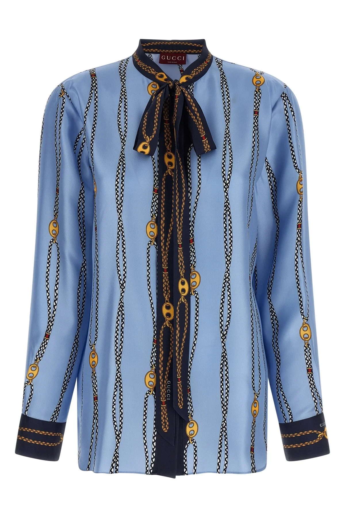 cod. 856109ZAUK54061 Patterned silk shirt, lavalliere collar, concealed front button closure, long cuffed sleeves, rounded hem. Color: Light Blue Size & Fit: Comfort fit Composition: 100% silk Made in: Italy