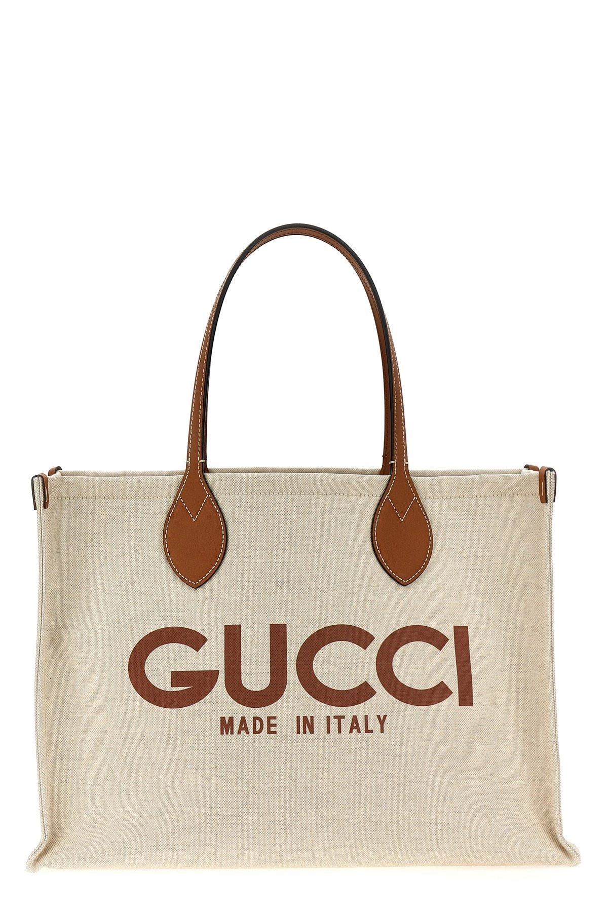 cod. 772176FACUL8451 Canvas shopping bag with front logo print, leather details, double handle, removable inner clutch, adjustable and removable leather shoulder strap. Color: Beige Size & Fit: W 41.5 x H 29 x D 18 cm Composition: 59% polyurethane 24% cotton 17% linen