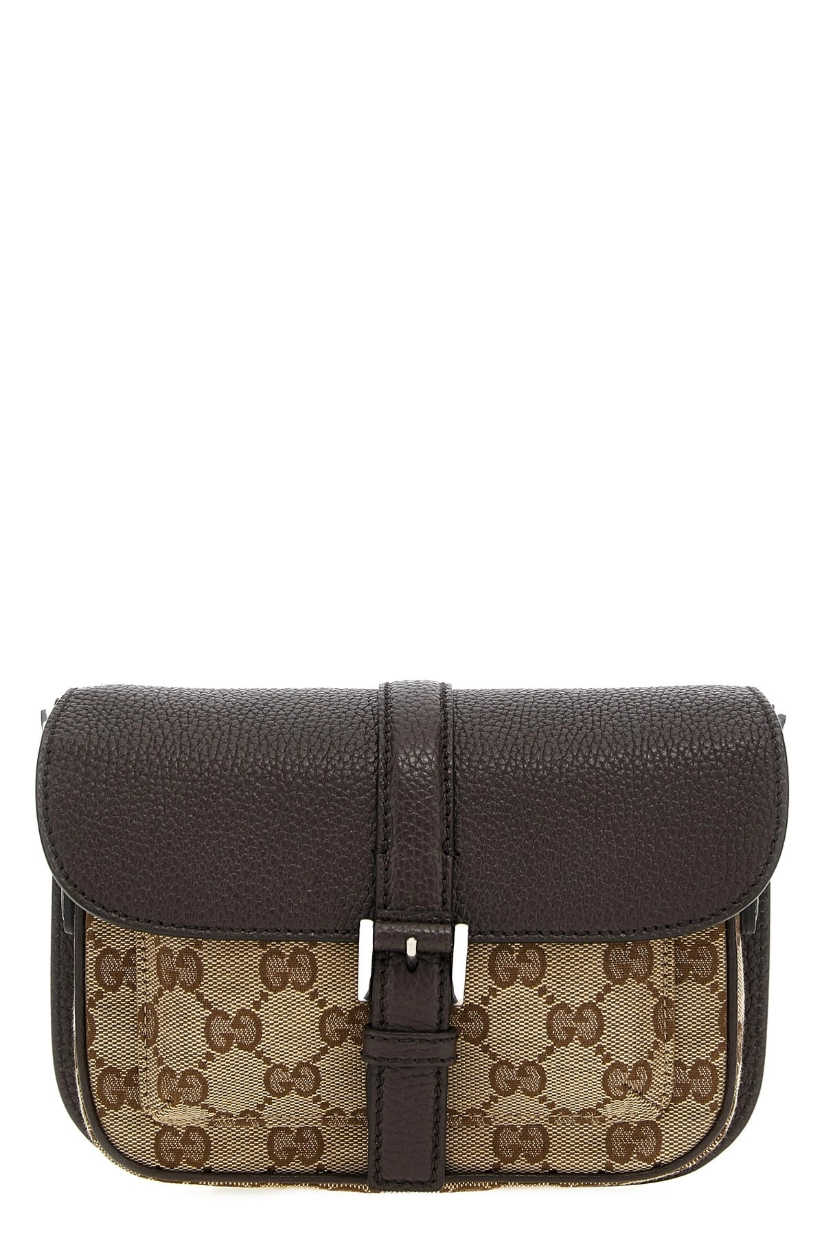 cod. 795213FADMD9793 'Mini GG' crossbody bag in Original GG fabric and leather, magnetic closure, adjustable and removable shoulder strap. Color: Brown Size & Fit: W 20 x H 13 x D 5 cm Composition: 65% polyester 18% cotton 17% polyamide Made in: Italy