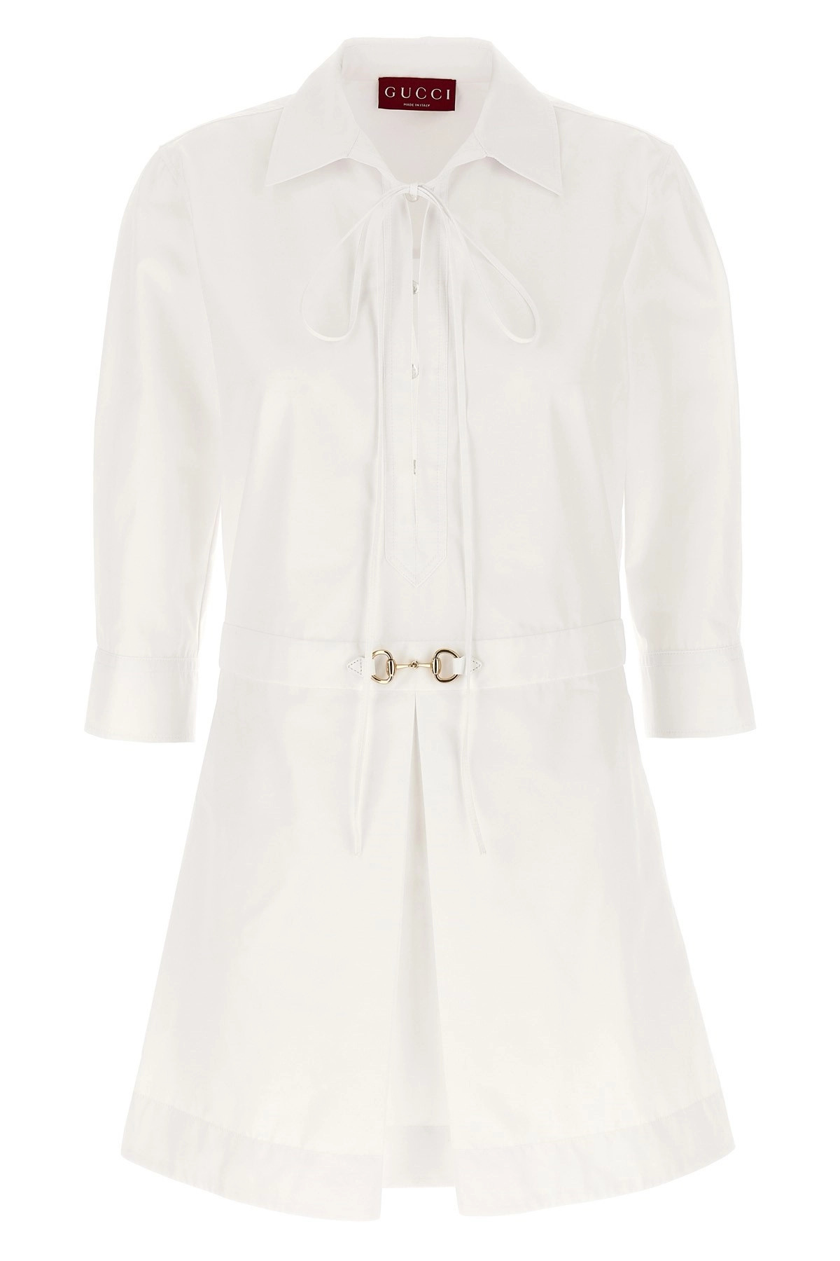 cod. 832066Z8B119000 Chemisier mini dress in cotton poplin with ribbon collar, metal clamp detail and front button closure, pleated skirt, and 3/4 sleeves. Color: White Size & Fit: true to size fit Composition: 100% cotton Made in: Italy