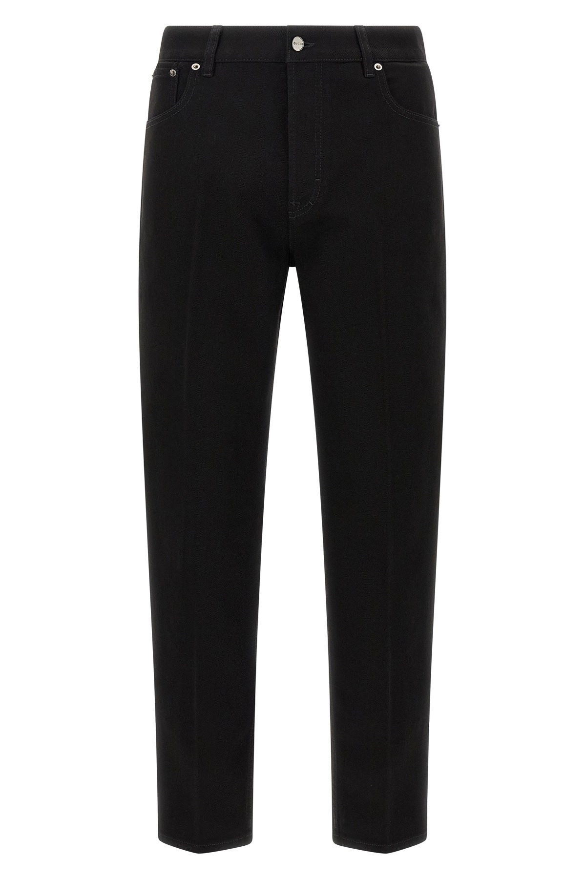 cod. 835215XDDCD1043 Washed cotton denim jeans with carded finish, crop model, expanded pleat, front button closure, five pockets, metal 'Morsetto' details and 'Gucci Rosso Ancora' naplak logo label at the back. Color: Black Size & Fit: Slim fit Composition: 100% cotton Made in: Italy