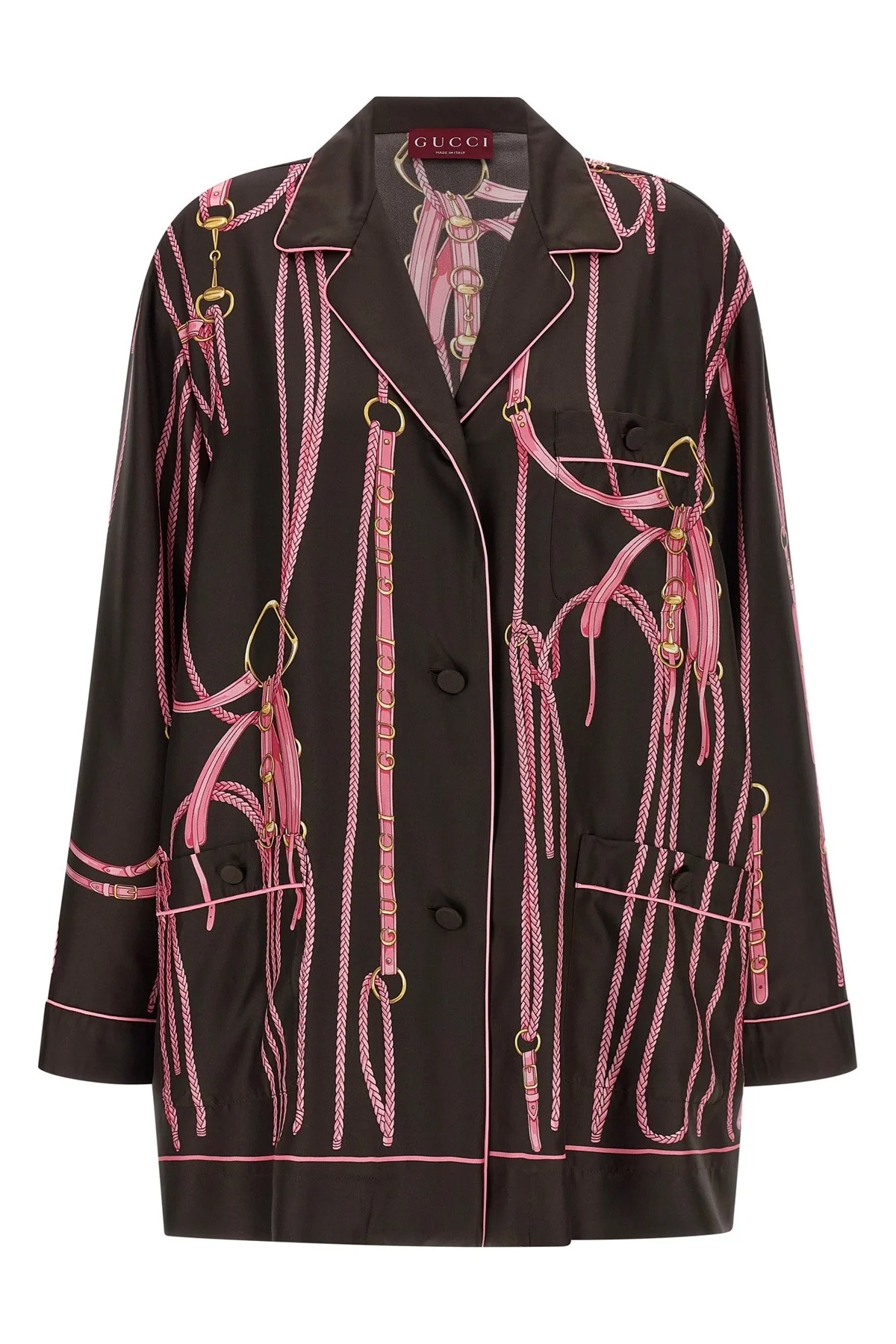cod. 848553ZAT9Y2083 All-over clamp print silk shirt, pajama style with peak lapel neckline, front pockets, front button closure, contrast piping, long sleeves. Color: Multicolor Size & Fit: Comfort fit Composition: 100% silk Made in: Italy