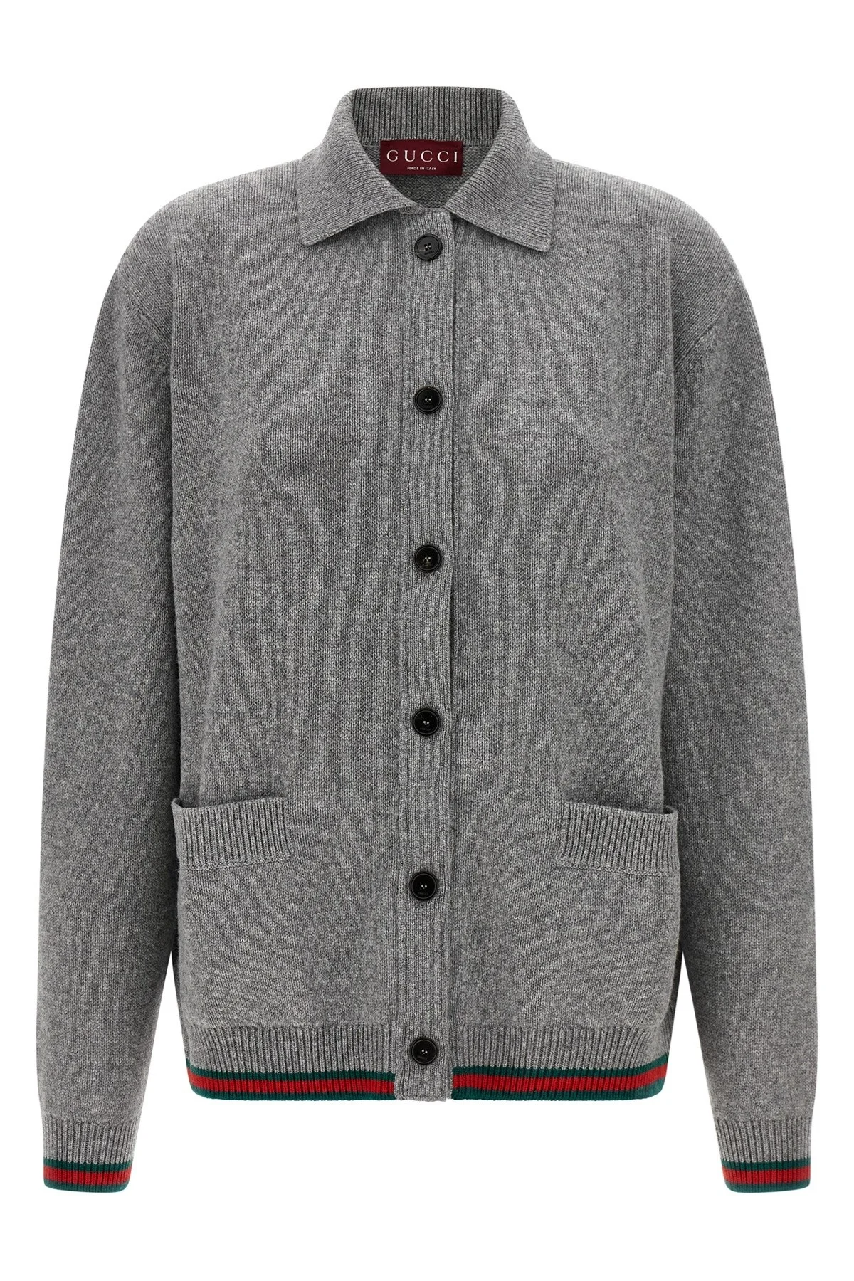 cod. 848257XKE921084 Polo style cashmere blend cardigan with collar, front button closure, front pockets, Web band intarsia detail on the bottom and cuffs. Color: Gray Size & Fit: True to size fit Composition: 70% wool 30% cashmere Made in: Italy