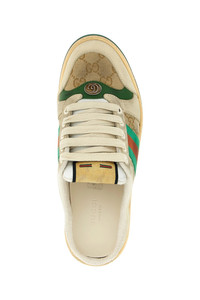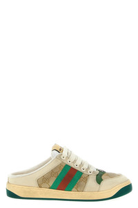 cod. 836063FAEPQ9641 Original GG leather and fabric Screener sabots, green and orange vintage effect nylon web ribbon, treated for a vintage and worn effect, enamelled oval detail with double G in metal, Gucci vintage logo label, two-tone rubber sole, lace-up closure. Color: Multicolor Size & Fit: EU WOMEN Composition: 65% polyester 18% cotton 17% polyamide Made in: Italy