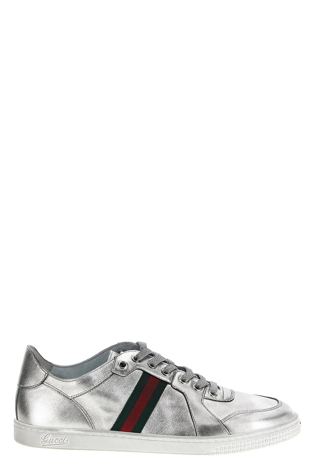 cod. 867002AAGHR8156 'Stretch' metallic leather sneakers with hand-crafted lived-in effect, 'Nastro Web' grosgrain on the side, metal 'Incrocio GG' on the toe, lace-up closure, tonal 'Incrocio GG' patch on tongue, Rubber. 'La Famiglia' collection. Handcrafted product, any imperfections are to be considered characteristics of uniqueness. Color: Silver Size & Fit: EU WOMEN Composition: 100% lamb leather (Ovis aries) Made in: Italy