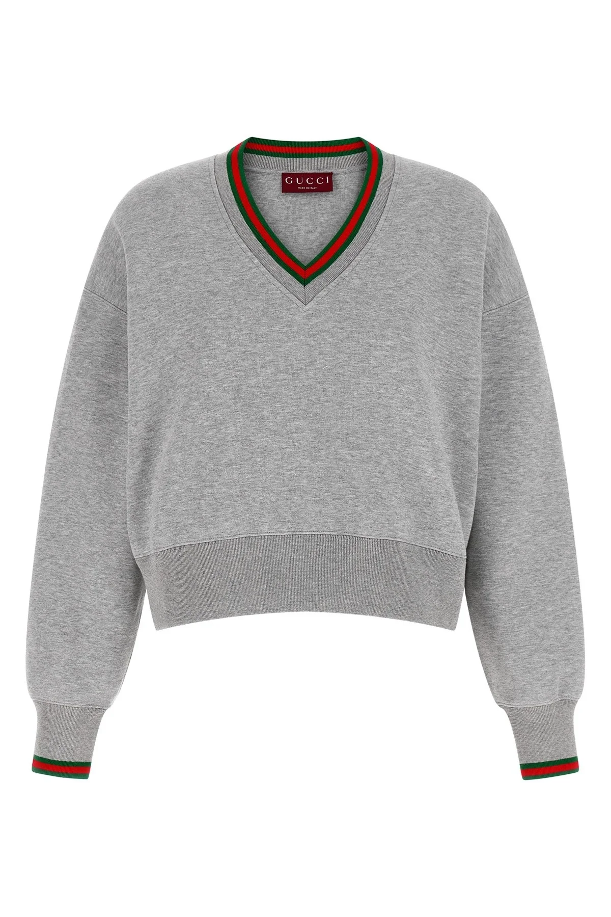 cod. 847933XJHIR1160 Melange cotton jersey sweatshirt with 'Web' piping, V-neck, long sleeves with cuffs and dropped shoulders, and band on the hem. Color: Gray Size & Fit: Relaxed fit Composition: 60% cotton 40% polyamide Made in: Italy