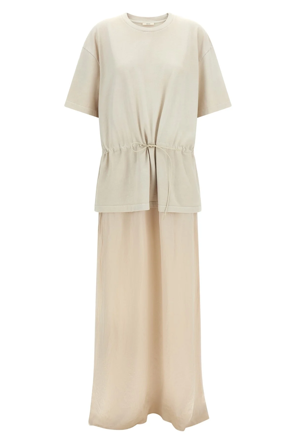 cod. HEW54151TJ065PXT0551 Long 'Joopy' dress consisting of cotton jersey t-shirt on top, crew neck, short sleeves with dropped shoulders, drawstring at the waist and lower part in wrinkled satin-effect fabric, wide and straight silhouette, wide side split, garment with raw cut hem. Color: Beige Size & Fit: true to size fit Composition: 100% cotton Made in: Italy