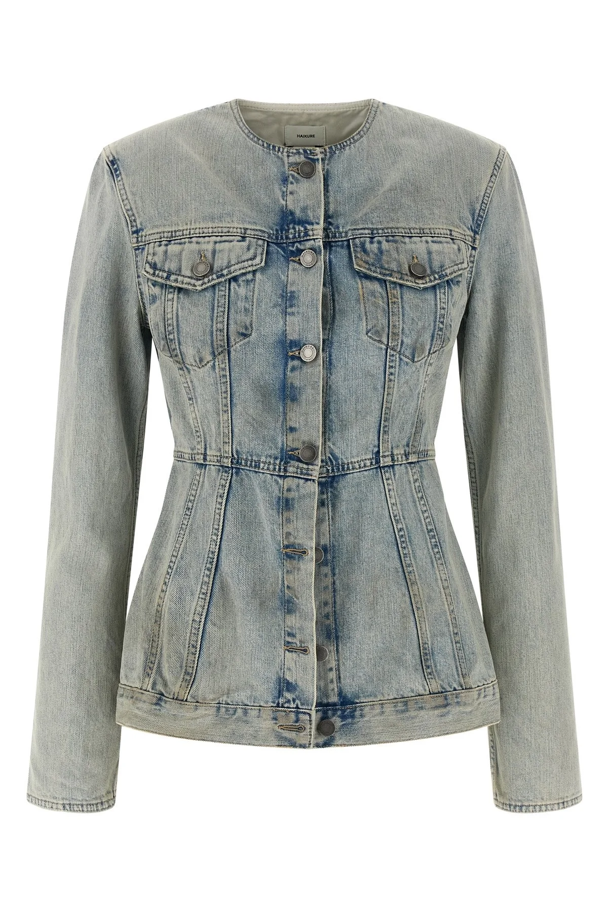 cod. HEW09117DF203L0936L0936 'Temple' unlined jacket in used-effect stone washed cotton denim with hourglass silhouette with marked waist, crew neck, front metal button closure, pockets, long sleeves with slit on the cuffs, and leather logo label on the back. Color: Light Blue Size & Fit: true to size fit Composition: 100% cotton Made in: Italy