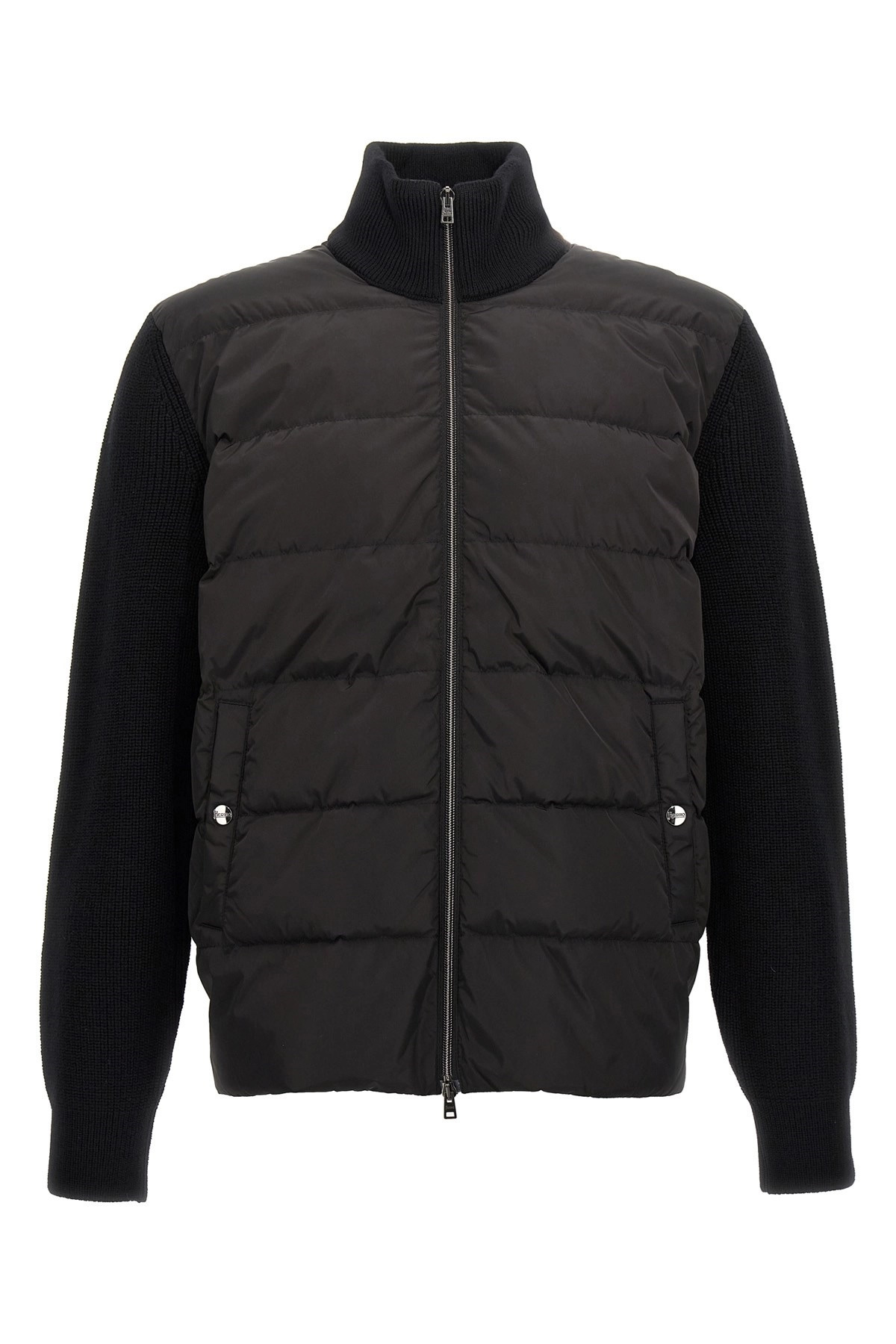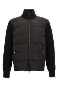cod. MP000126U700619300 Two-material nylon down jacket with feather and wool knit padding, zip closure, pockets, long cuffed sleeves. Color: Black Size & Fit: true to size fit Composition: 100% wool Made in: Turkey