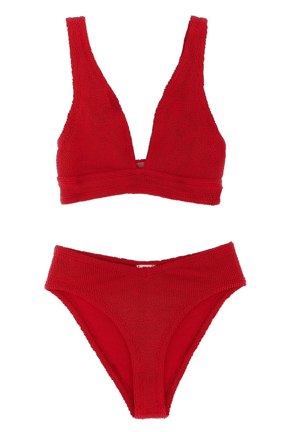 cod. ANGELBIKINIRED The Original Crinkle™ Angel fabric bikini consisting of under-breast band top, V-neck front and back, full breast support and V-waist bottoms. Color: Red Size & Fit: One size Composition: 97% polyamide 3% elastane Made in: Morocco