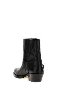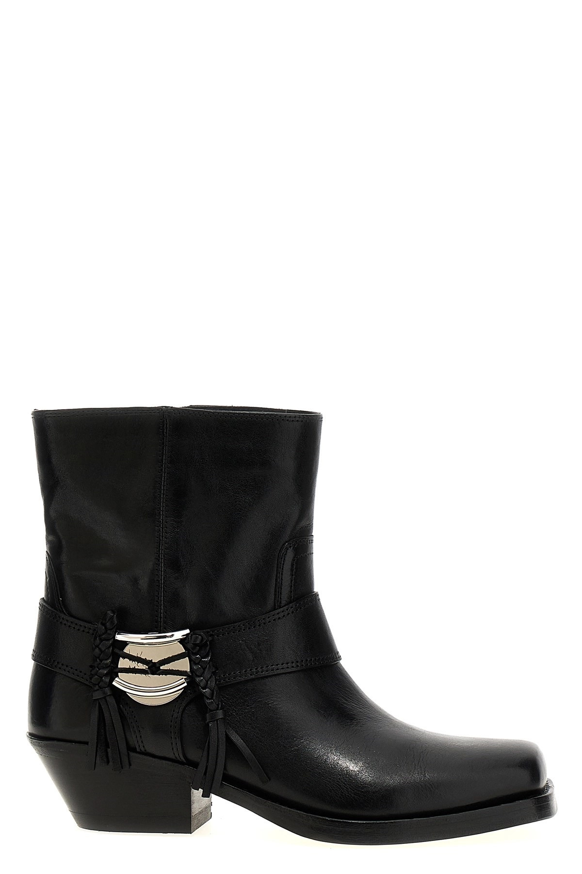 cod. BO0165FAB4A21S01BK 'Akson Gaucho' leather ankle boots with square toe, leather belt loop with metal and braided leather detail, leather sole, heel. Color: Black Size & Fit: EU WOMEN Heel: 4 cm Composition: 100% cow leather (Bos Taurus) Made in: Portugal