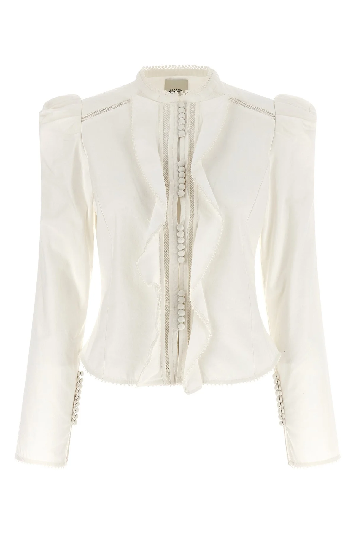 cod. CH0285FAD1I02I20WH Victorian cotton 'Calina' shirt with ruffle inserts, mesh fretwork and crochet finish, crew neck, front button closure, long puff sleeves with buttons and slit on the cuffs. Color: White Size & Fit: slim fit - FRENCH size Composition: 100% cotton Made in: India