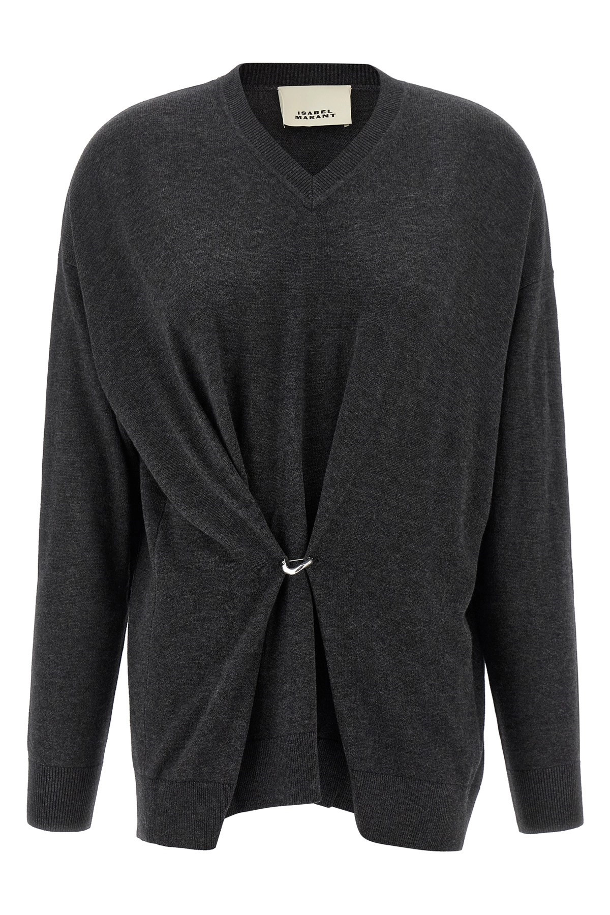 cod. PU0717FAB1L05I02AN 'Chiraz' viscose and wool sweater, removable metal brooch detail on the front, V-neck, long sleeves with cuffs and dropped shoulders. Color: Gray Size & Fit: oversize fit - FRENCH size Composition: 70% viscose, 30% wool Made in: China