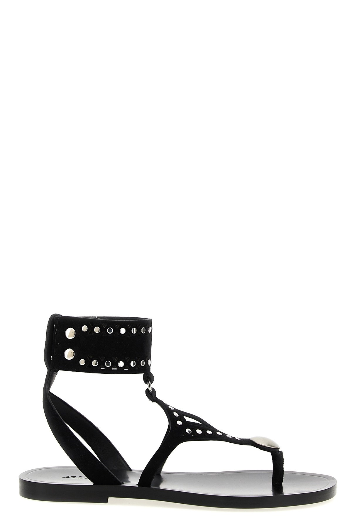 cod. SD0239FAC2B01SBKSI Edil' suede sandals with cut-out details and all-over stud details, flip-flop style, adjustable strap with ankle snap buttons, leather sole. Color: Black Size & Fit: EU WOMEN Composition: 100% calfskin leather (Bos Taurus) Made in: Italy