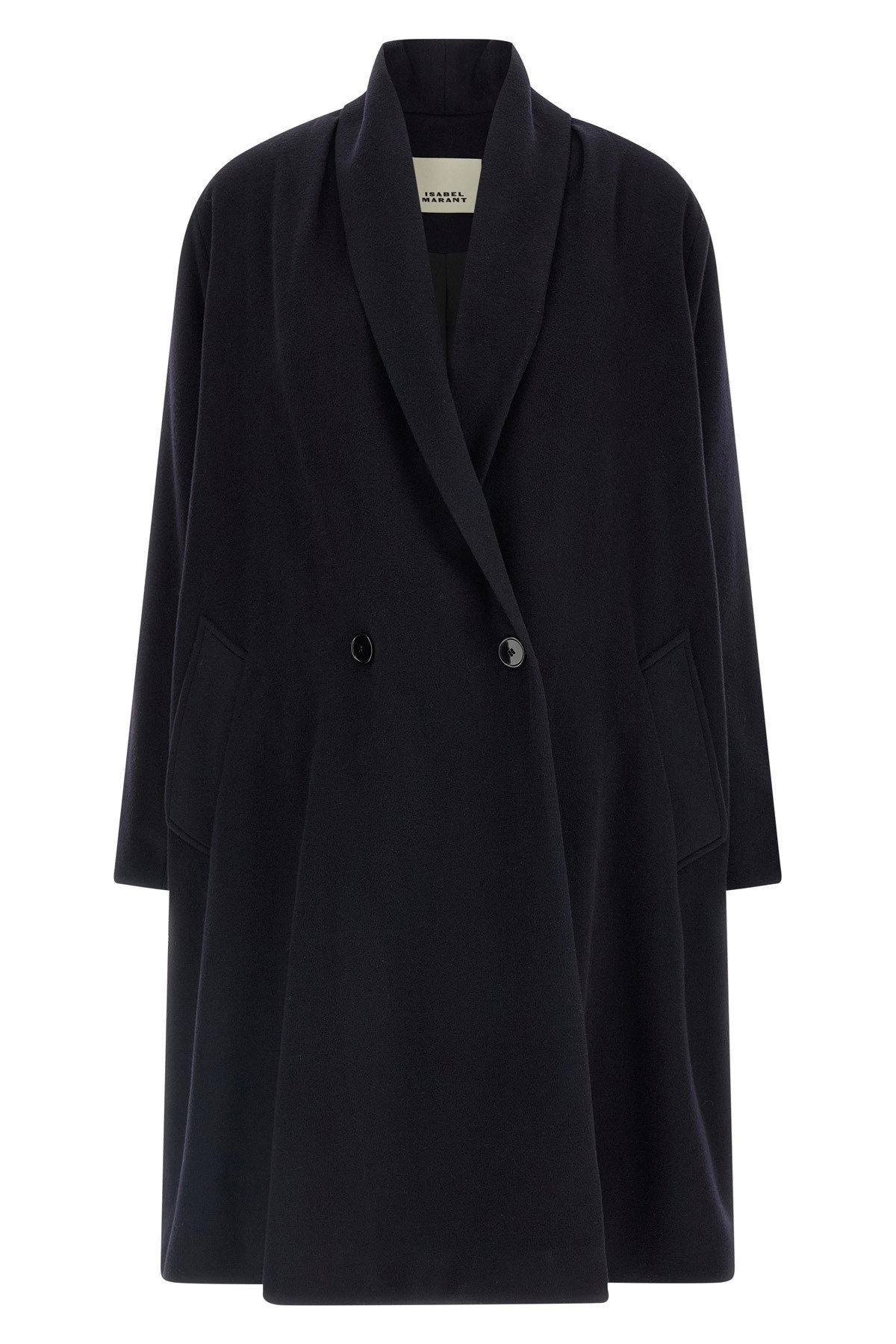cod. MA0466FAC3D03IBKMD 'Elise' double-breasted wool blend long coat with front button closure, shawl collar, pockets, long sleeves with dropped shoulders, monogram twill lining. Color: Black Size & Fit: comfort fit - FRENCH size Composition: 75% vw 20% pa 5% ws Made in: Poland