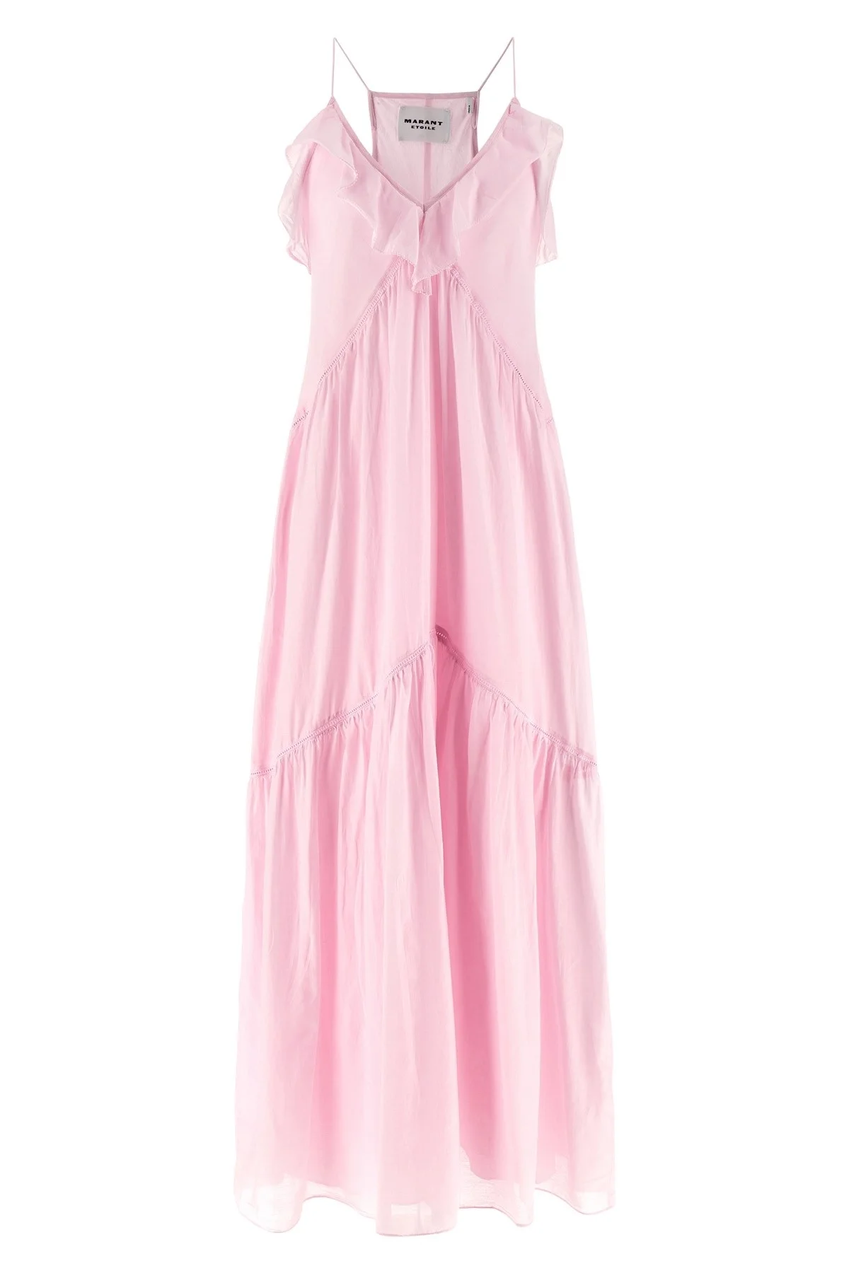cod. RO1003FBB3J04E40LK Long 'Vasma' dress in cotton voile with column point details, flared silhouette, front V-neck with crochet-finish ruffles, back American neckline, asymmetrical hem, lining. SUSTAINABLE: This product is made with organic cotton. Color: Pink Size & Fit: true to size fit - FRENCH size Composition: 80% cotton 20% viscose Made in: India