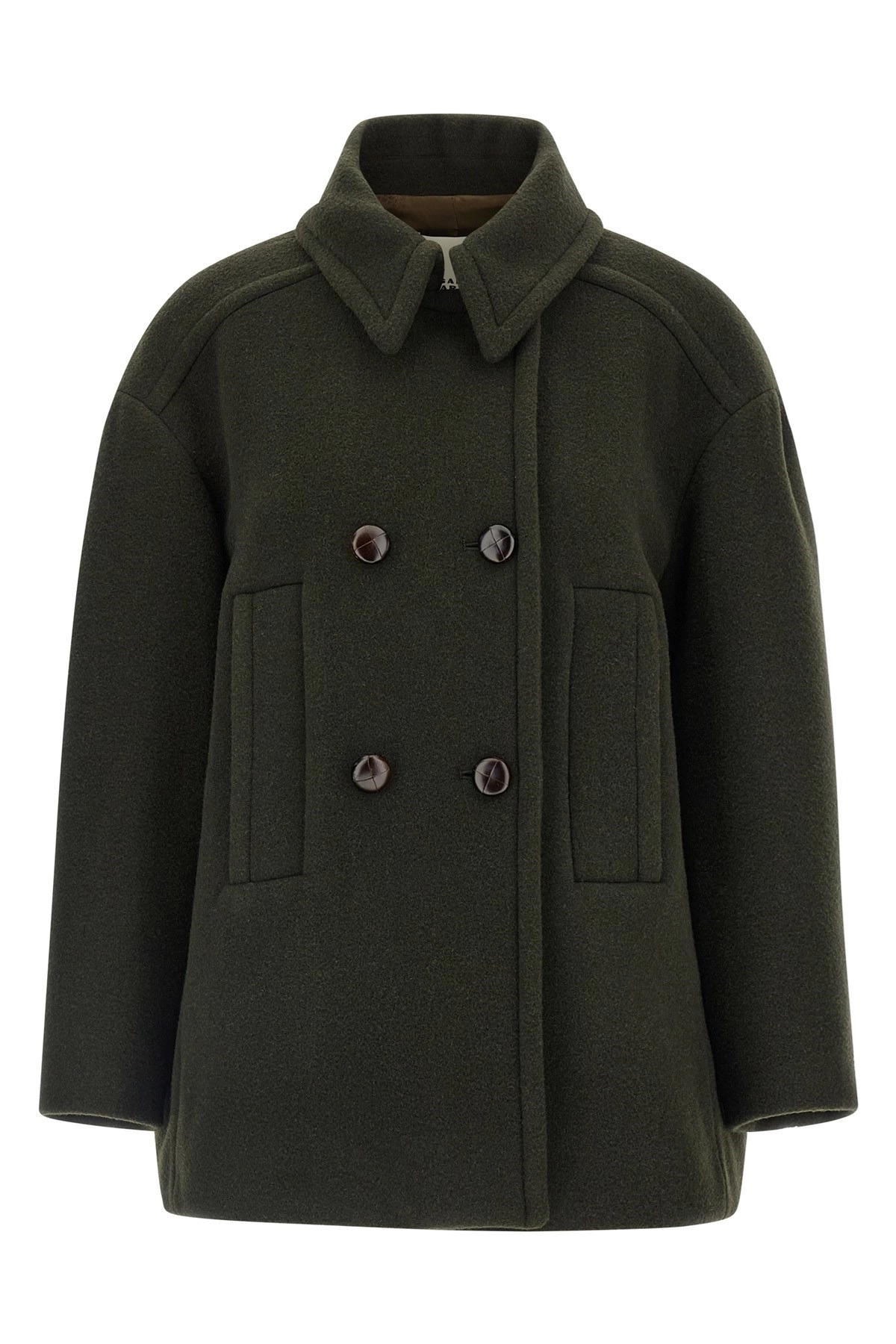 cod. MA0455FAB1D03I67DK 'Fiby' double-breasted short wool blend coat with front button closure, shirt collar, pockets, long sleeves, monogram satin lining. Color: Green Size & Fit: true to size fit - FRENCH size Composition: 75% wv, 25% pa Made in: Bulgaria