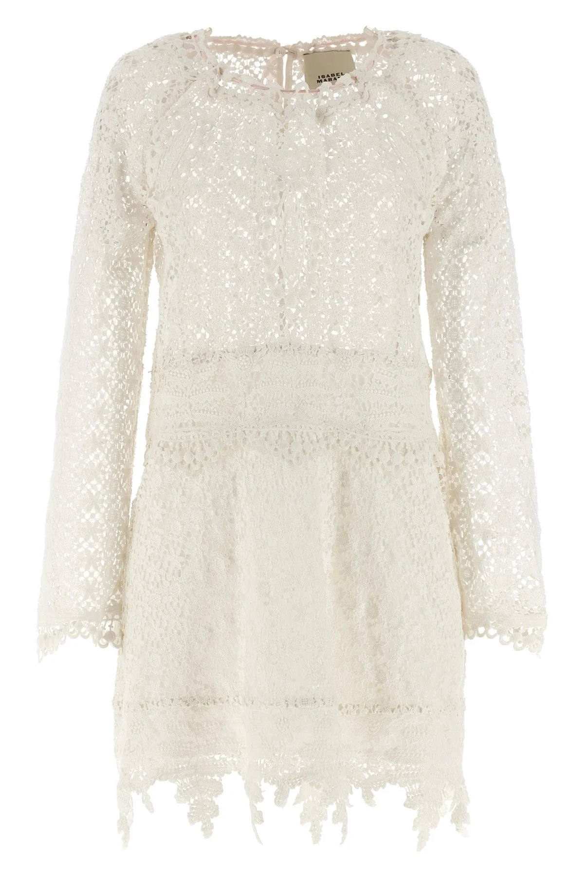 cod. RO0993FAD1J02I20WH Mini 'Hizene' crochet openwork cotton dress, hourglass silhouette, crew neck with button closure and contrast back lace and teardrop cut-out detail, side zip closure, long sleeves with flared and asymmetrical cuffs, asymmetrical hem. Color: White Size & Fit: true to size fit - FRENCH size Composition: 100% cotton Made in: India