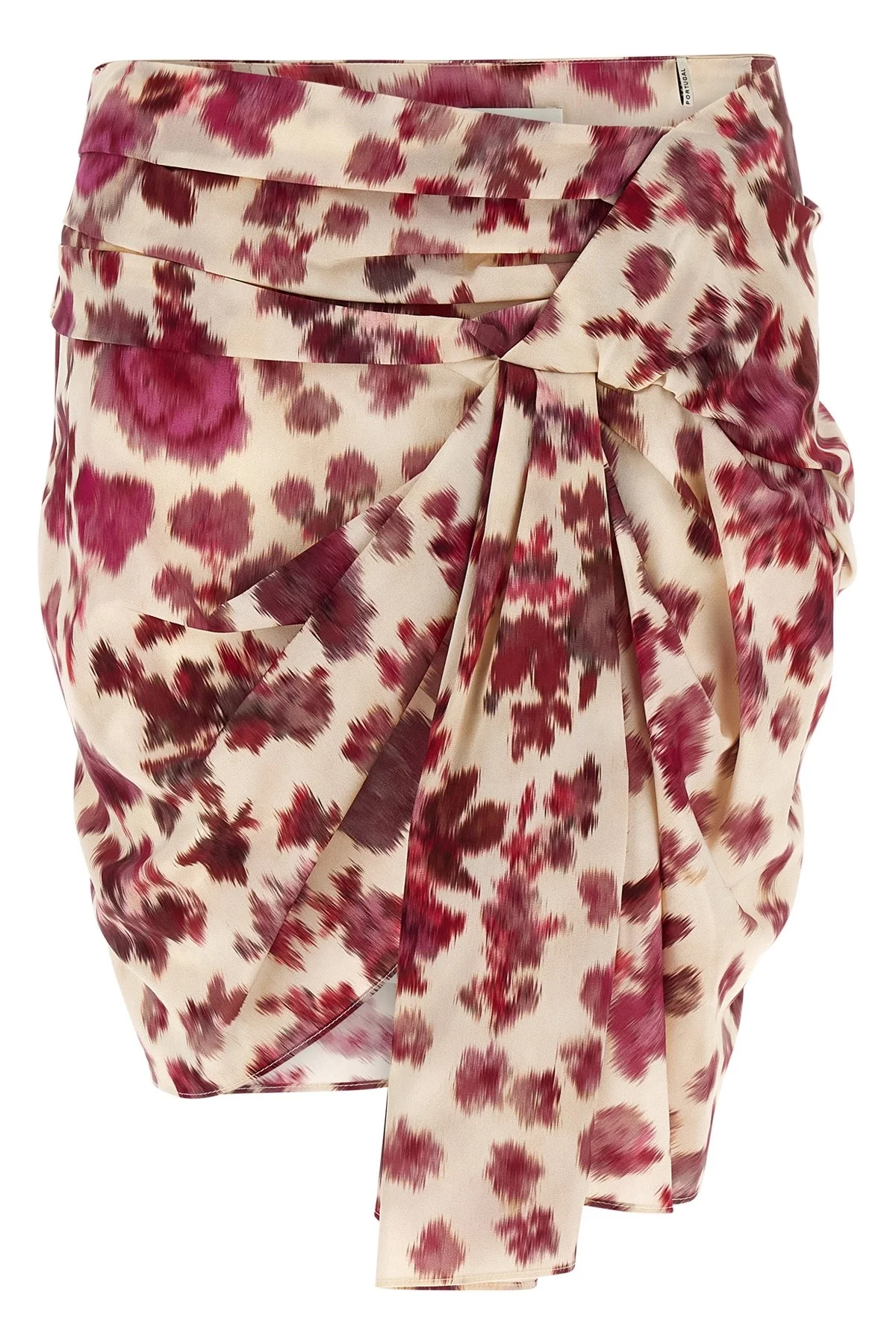cod. JU0422FCD1J11I40PK Draped mini 'Ovia' skirt in stretch silk with rose print, Side zip closure, front knotted panel detail, asymmetrical hem, lined. Color: Pink Size & Fit: slim fit - FRENCH size Composition: 91% silk, 9% elastane Made in: Portugal