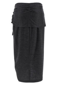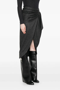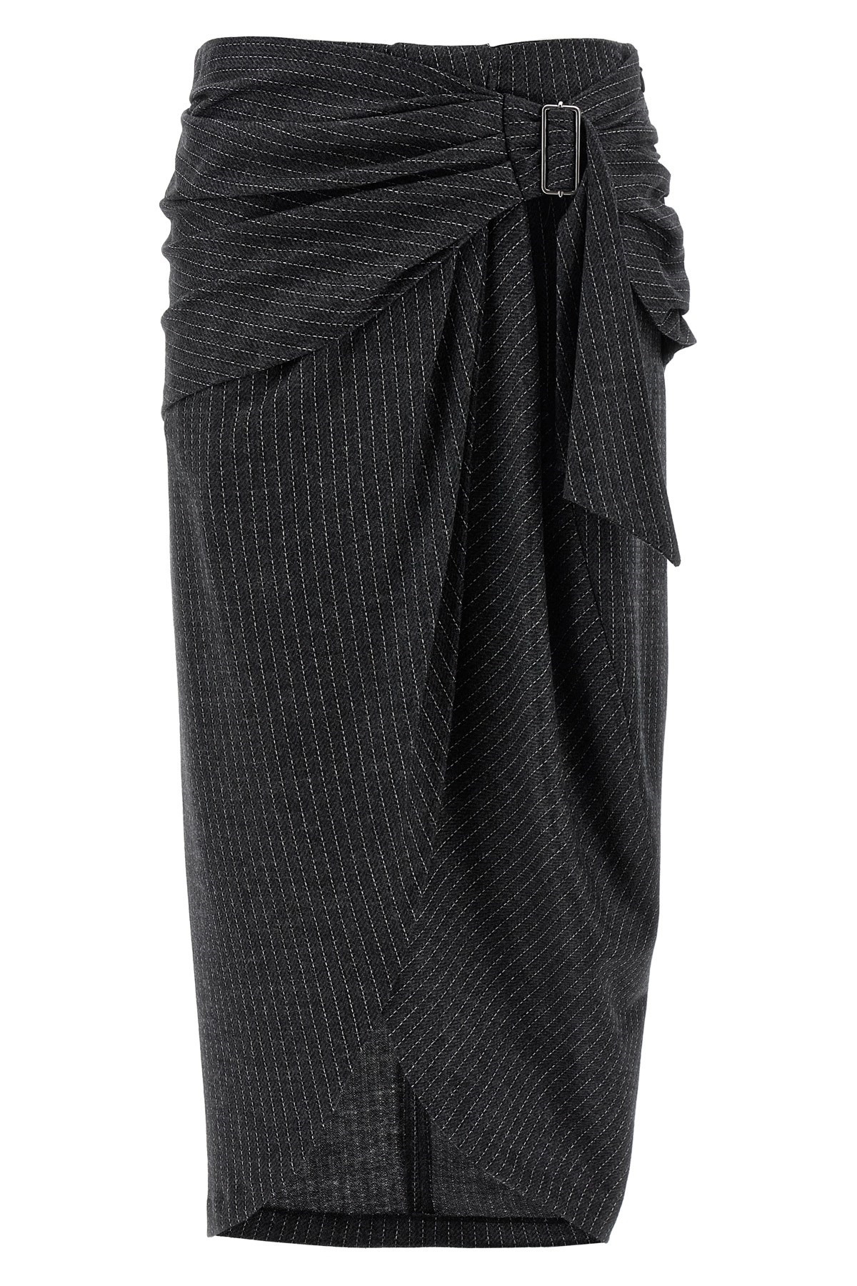 cod. JU0417FAC4J12I02AN Reilly' sheath midi skirt in striped virgin wool and cotton, draped waist with side buckle detail, concealed back zip closure, and tight cut asymmetrical length. Color: Gray Size & Fit: True to size fit French size Composition: 86% virgin wool, 14% cotton Made in: Poland
