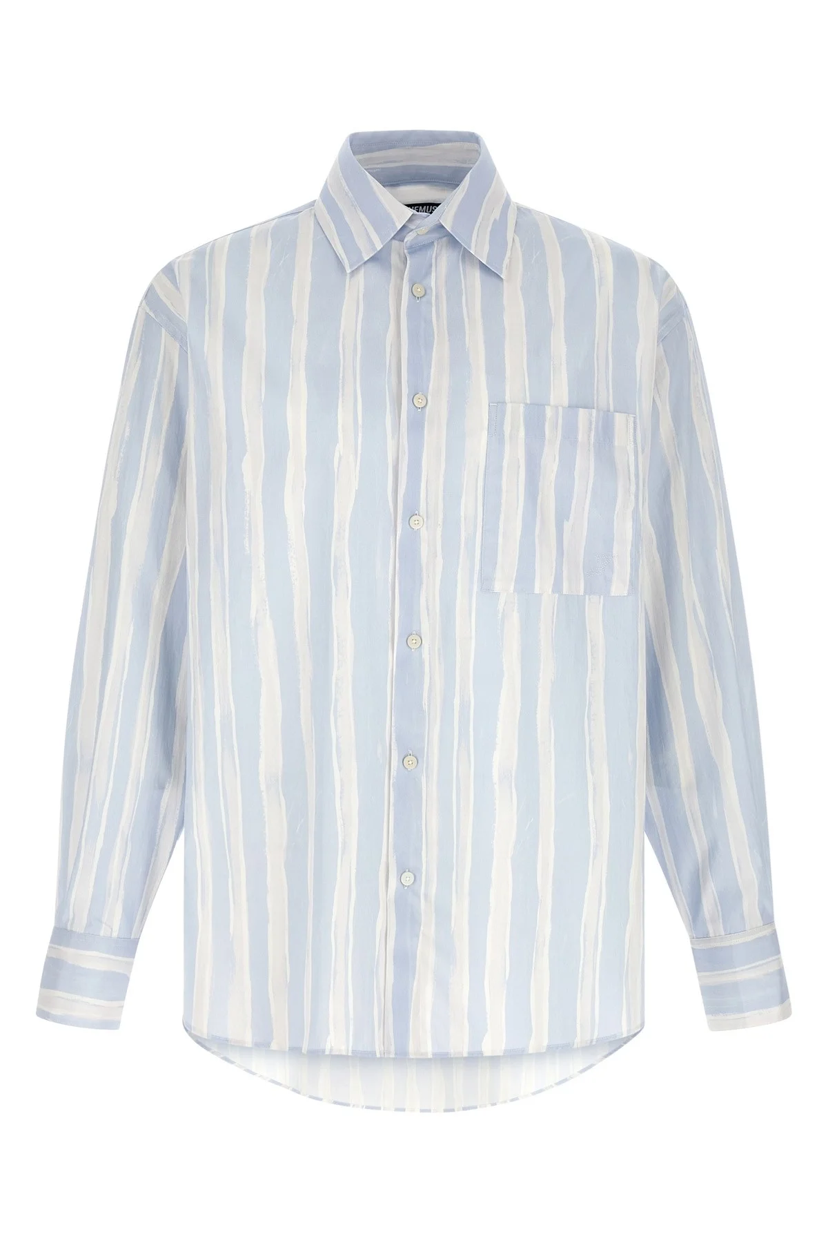 cod. 26ESHM00605AW006913GT 'La Chemise Camargue' striped cotton poplin shirt with paint effect, pocket with logo embroidery, front button closure, long sleeves with cuffs and dropped shoulders, asymmetrical hem. Color: Light Blue Size & Fit: oversized fit Composition: 100% cotton Made in: France