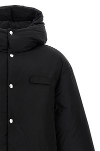 cod. 24HOUM00094AW00121990 'La Doudoune' down jacket in padded water-repellent fabric, tone-on-tone logo patch with removable velcro, hood, high neck, front zip and snap button closure, pockets, long sleeves with elastic cuffs, drawstring at the hem. Color: Black Size & Fit: Boxy fit Composition: 100% polyamide Made in: France