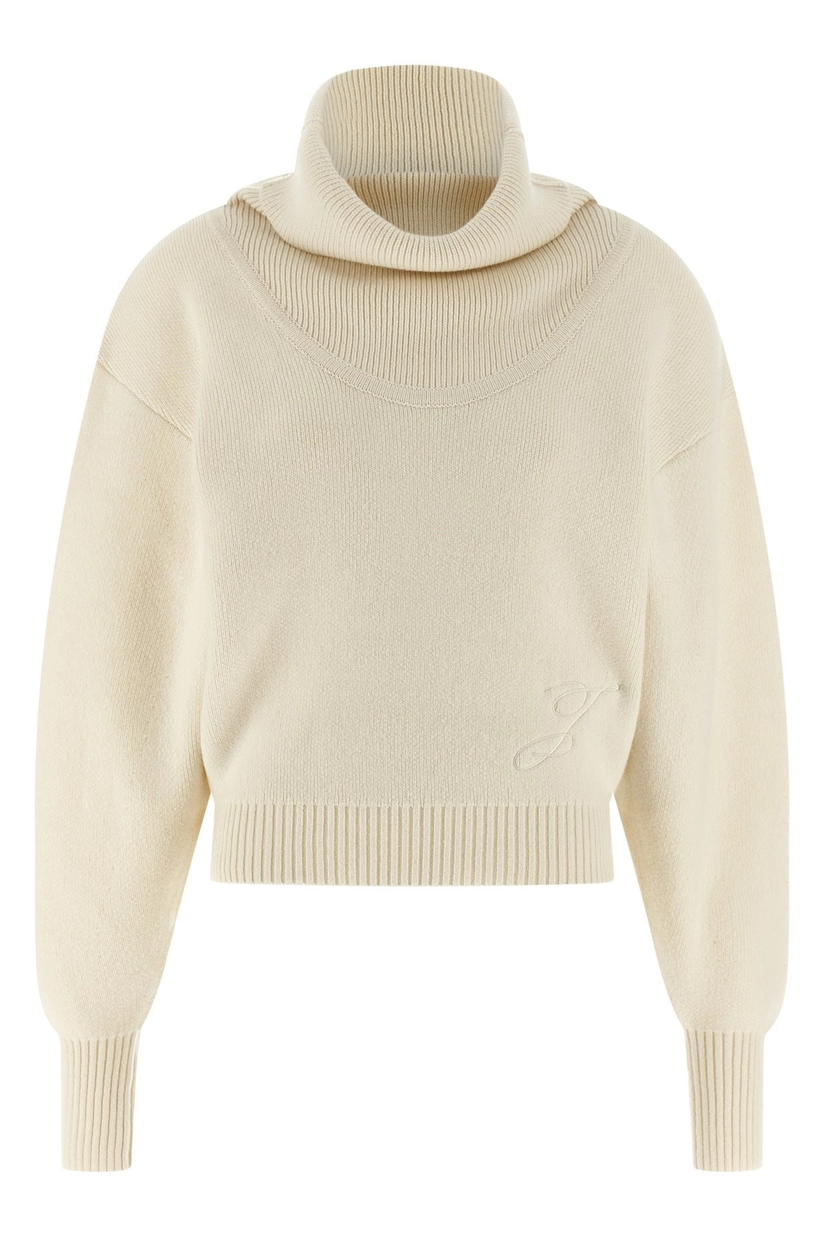 cod. 25HSWW00624AK00278110 La Maille Pallone' virgin wool and heavy cashmere sweater with tone-on-tone logo embroidery on the front, turned-up crater high neck, long wide sleeves with cuffs and dropped shoulders. Color: White Size & Fit: boxy fit - FRENCH size Composition: 90% virgin wool 10% cashmere Made in: Italy