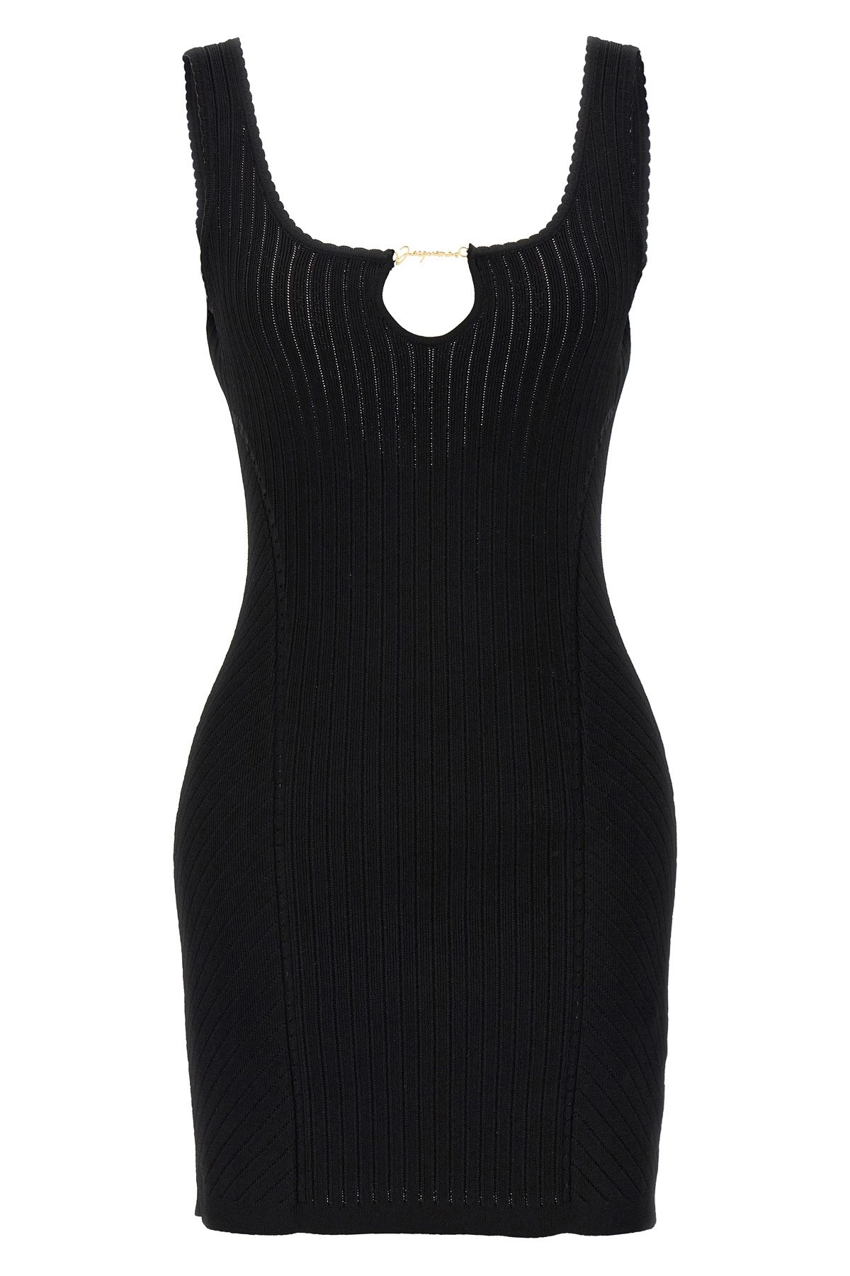 cod. 24E241KN3552355990 'La mini robe Sierra' dress in ribbed viscose blend with front cut-out detail with gold metal logo charm, sleeveless. Color: Black Size & Fit: true to size fit French size Composition: 88% viscose, 12% polyester Made in: Portugal