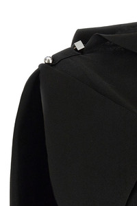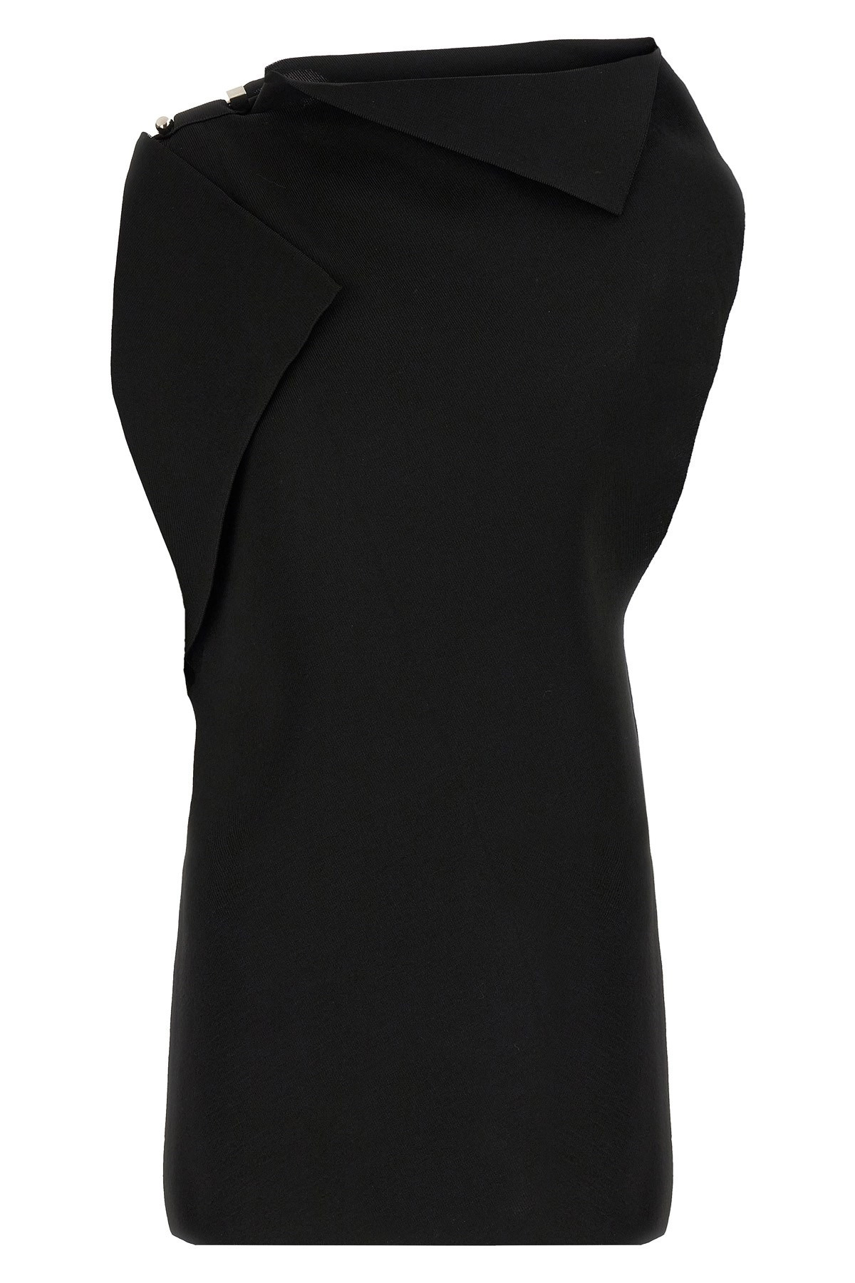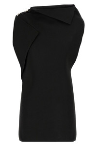 cod. 25E251KN6082437990 'La Mini Robe Trapeze' dress in 3D effect viscose knit, asymmetrical and draped shape, boat neck, sleeveless, metal Rond-Carre brooch on the shoulder. Color: Black Size & Fit: true to size fit FRENCH size Composition: 60% viscose, 32% polyamide Made in: Italy