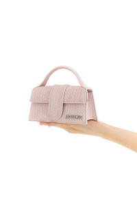 cod. 26EBAW00006AC39A02410 'Le Bambino' handbag in crocodile-effect embossed suede, magnetic flap closure, front metal lettering logo, fixed handle, back pocket, adjustable and removable shoulder strap. Each leather is unique and has been carefully selected by a team of artisans. The model may have any imperfections or natural color variations. Color: Pink Size & Fit: W 17.5 x H 9 x D 6 cm Composition: 100% calfskin leather (Bos Taurus) Made in: Italy PROMO CODE NOT APPLICABLE