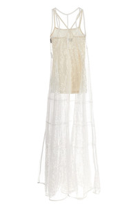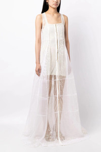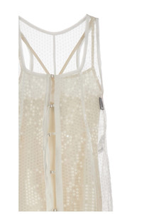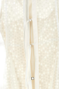 cod. 23H233DR068WHITE 'Le robe dentelle' dress in transparent fabric covered with tone-on-tone sequins, A-shaped and long to the floor, sleeveless model with a wide neckline and an open front part that can be closed with laces. Equipped with short petticoat. Color: White Size & Fit: true to size fit French size Composition: 70% polyester, 30% polyamide Made in: France