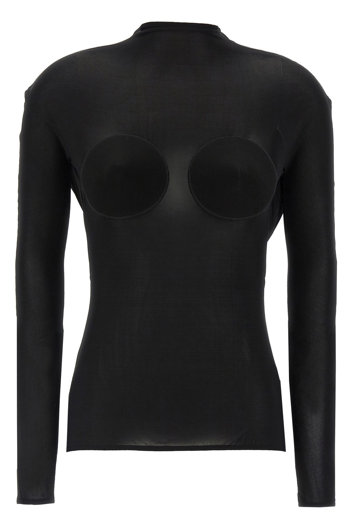 cod. 2534FTO279J08200 Semi-transparent lightweight jersey sweater, front cone volume detail, back neckline, long sleeves. Color: Black Size & Fit: True to size fit Composition: 94% viscose 6% elastane Made in: Portugal