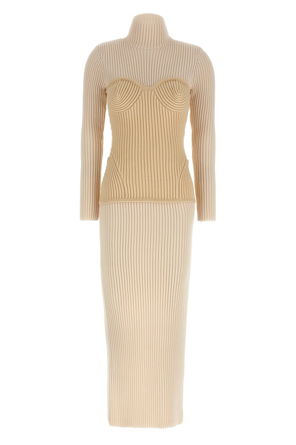 cod. 2503WDR005K0010103 Long dress in ribbed merino wool, trompe l'oeil corset silhouette with pre-shaped cups, high neck, long sleeves, back split. Color: White Size & Fit: true to size fit Composition: 100% merino wool Made in: Italy