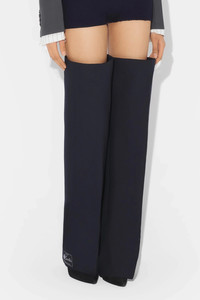 cod. 2504WAC036W04059 'The Blue Gaiters' virgin wool blend garter gaiter-style with upper inner elastic band, wide leg, logo patch on the bottom of the leg. Color: Blue Size & Fit: One size Composition: 77% polyester, 23% virgin wool Made in: Italy