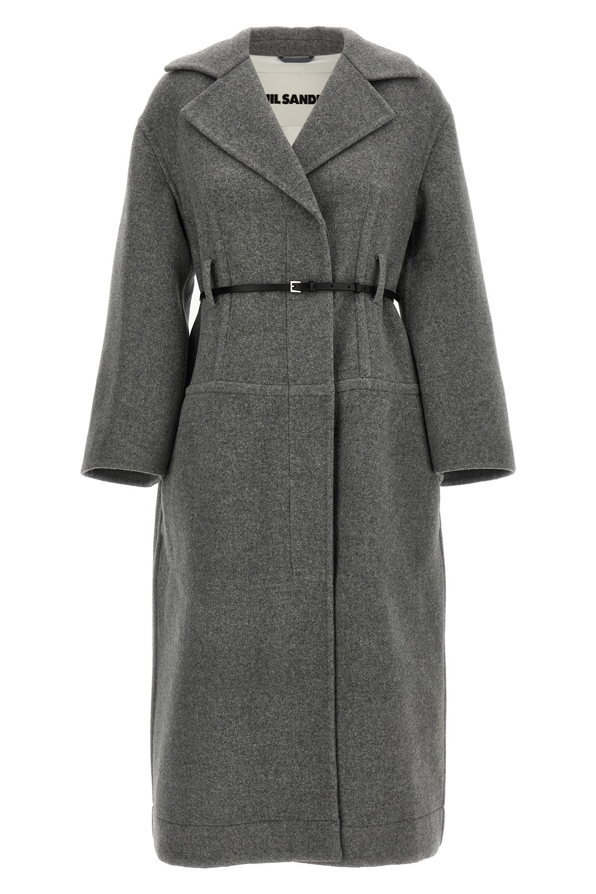 cod. J04AA0004J40020034 02' single-breasted structured coat in virgin wool felt with front button closure, pockets, wide long sleeves with dropped shoulders, back slit, and removable leather belt. Color: Gray Size & Fit: true to size fit - GERMAN size Composition: 100% virgin wool Made in: Italy
