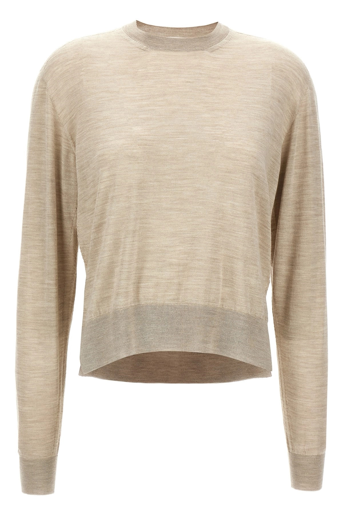 cod. J01GP0003J14501039 Asymmetrical wool and silk blend sweater with side splits, crew neck, long cuffed sleeves. Color: Beige Size & Fit: true to size fit German size Composition: 35% ws, 35% wv, 30% se Made in: Italy