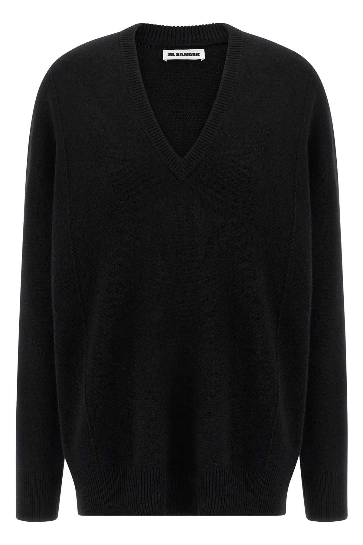 cod. J03GP0168J14818001 Wool and cashmere sweater with V-neck, long cuffed sleeves and a low shoulder. Color: Black Size & Fit: true to size fit - GERMAN size Composition: 70% wool 30% cachemire Made in: Italy