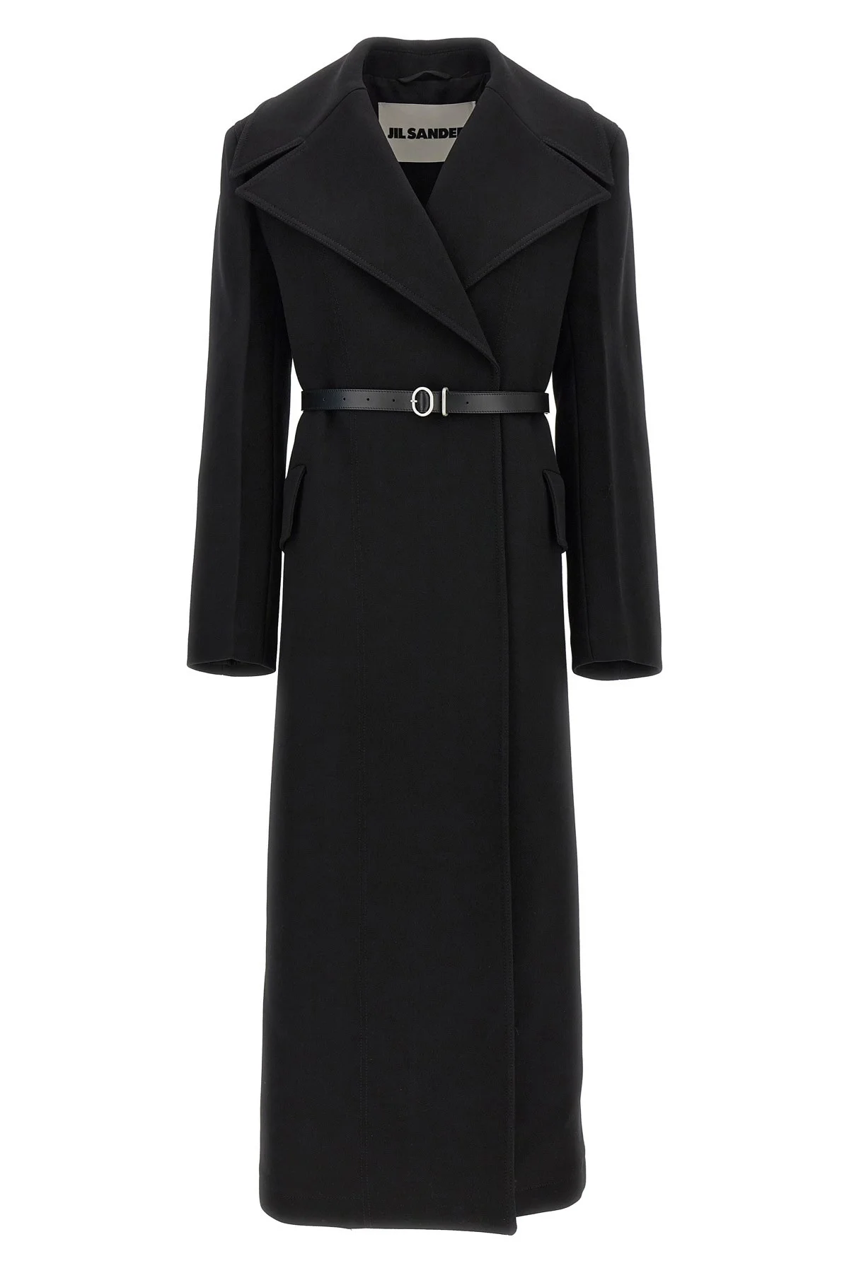 cod. J02AA0140J40178001 Compact wool double-breasted coat with button closure, pockets, padded shoulders, long sleeves, back split, leather belt to tie at the waist. Color: Black Size & Fit: true to size fit German size Composition: 100% wool Made in: Italy