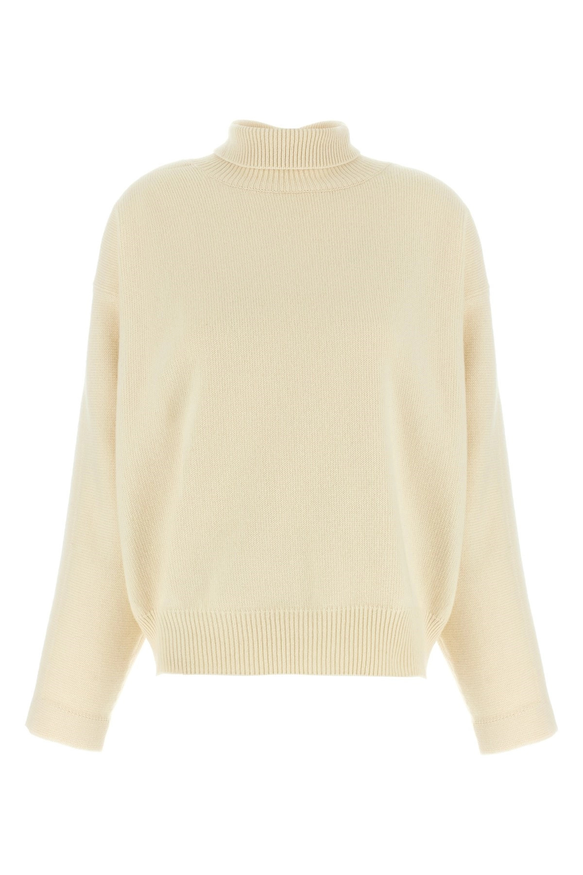 cod. J02GP0228J14804268 Merino wool and cashmere blend sweater with padded intarsia detail on shoulders and sleeves, high neck with back split, long sleeves with cuffs and dropped shoulders. Color: White Size & Fit: oversize fit - GERMAN size Composition: 80% wo, 12% co, 4% ws, 4% pl Made in: Italy