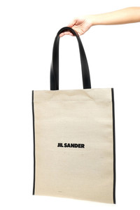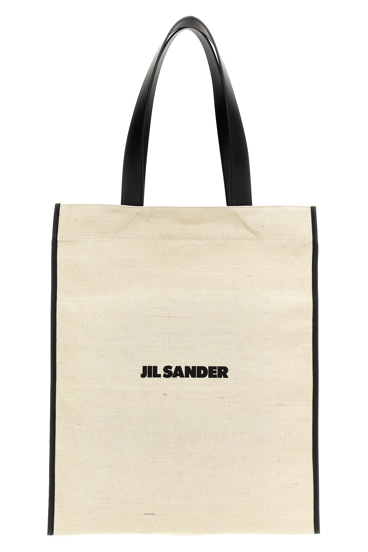 cod. J07WD0104P7060280 Medium 'Flat' canvas shopping bag with leather details, front logo print, double handle. Color: White/Black Size & Fit: W 40 x H 49 cm Composition: 61% jute 39% cotton
