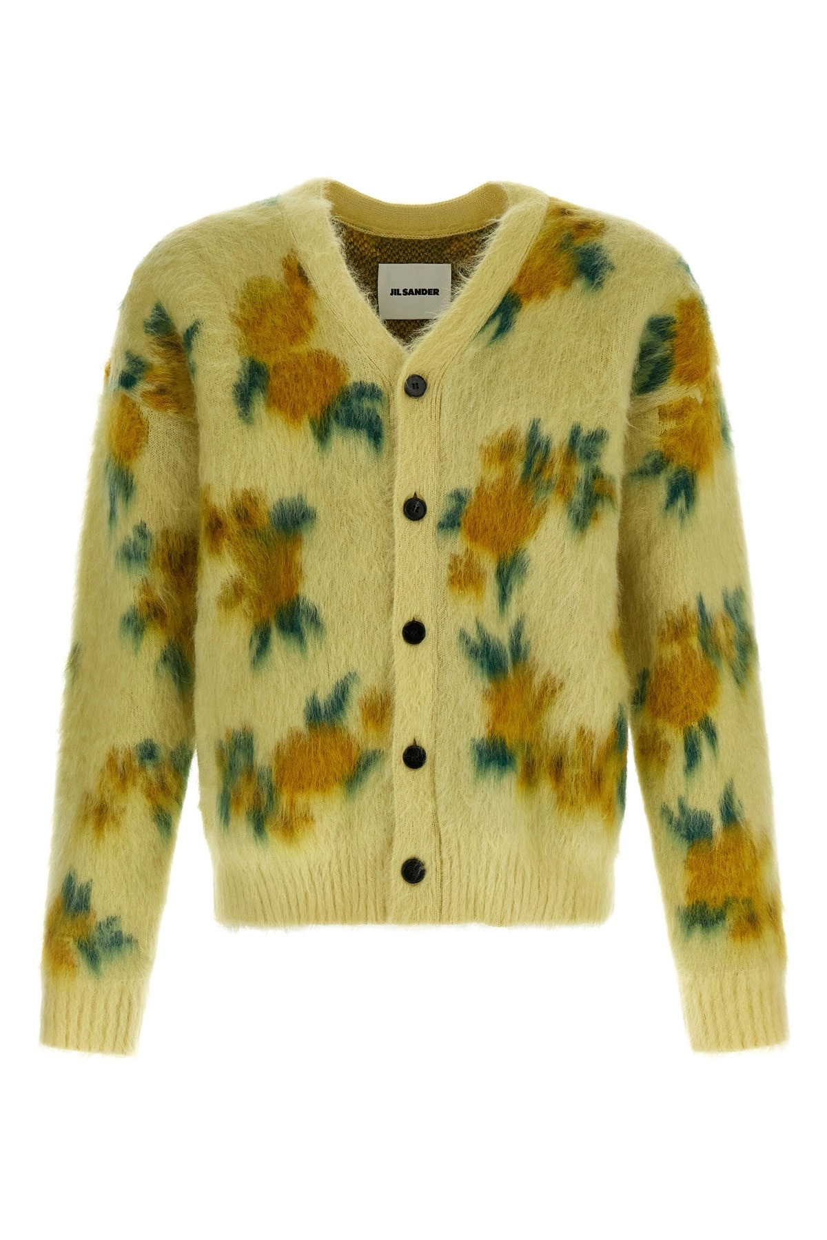 cod. J22HP0043J14785773 Mohair and silk blend cardigan with floral jacquard, V-neck, front button closure, long cuffed sleeves and dropped shoulders. Color: Yellow Composition: 57% wm, 27% se, 13% pa, 2% wo, 1% ea Size&Fit: oversized fit