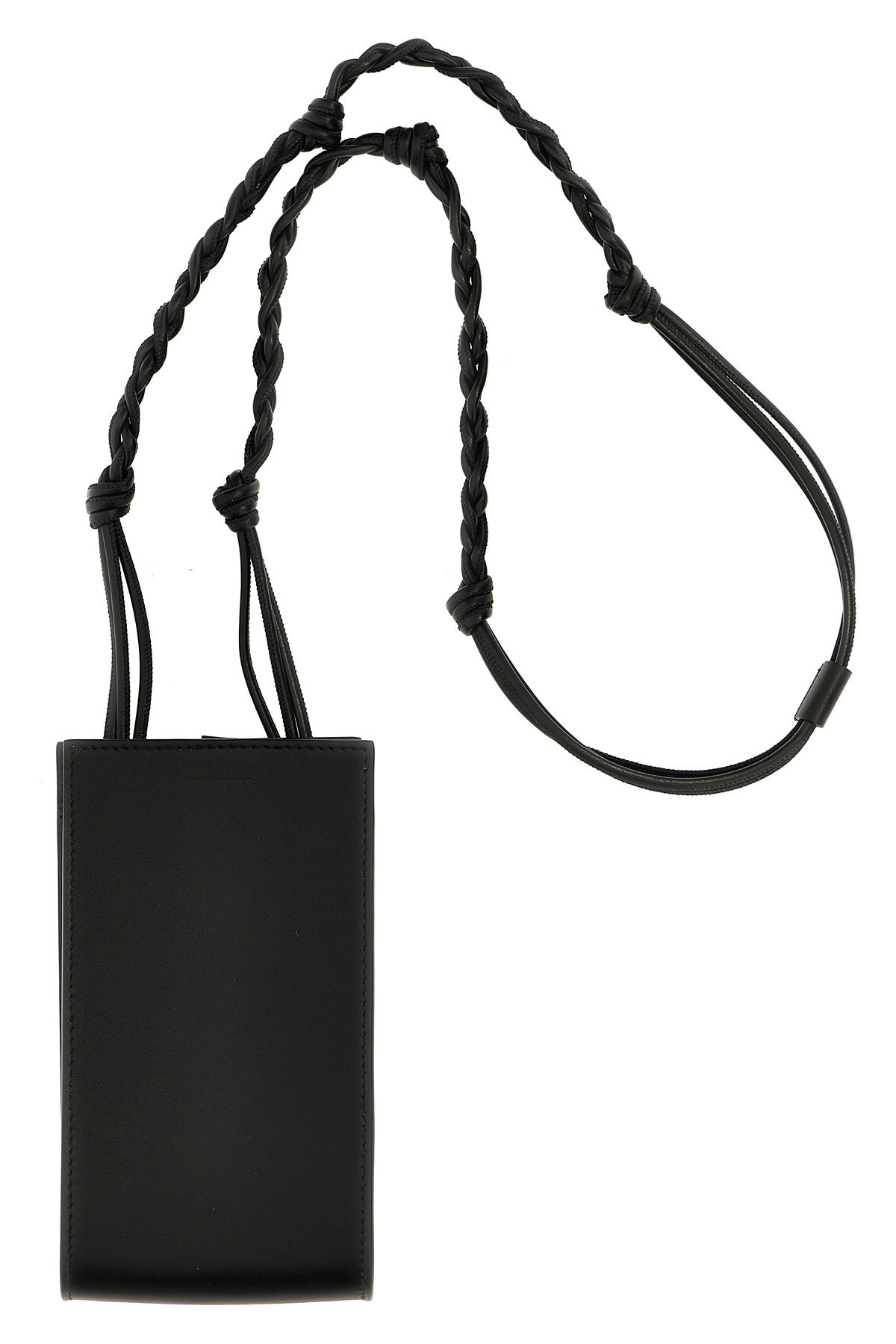 cod. J25VL0005P5995001 'Tangle' leather smartphone holder with woven shoulder strap. Color: Black Size & Fit: W 9.5 x H 17 x D 3 cm Composition: 100% calfskin leather (Bos Taurus)